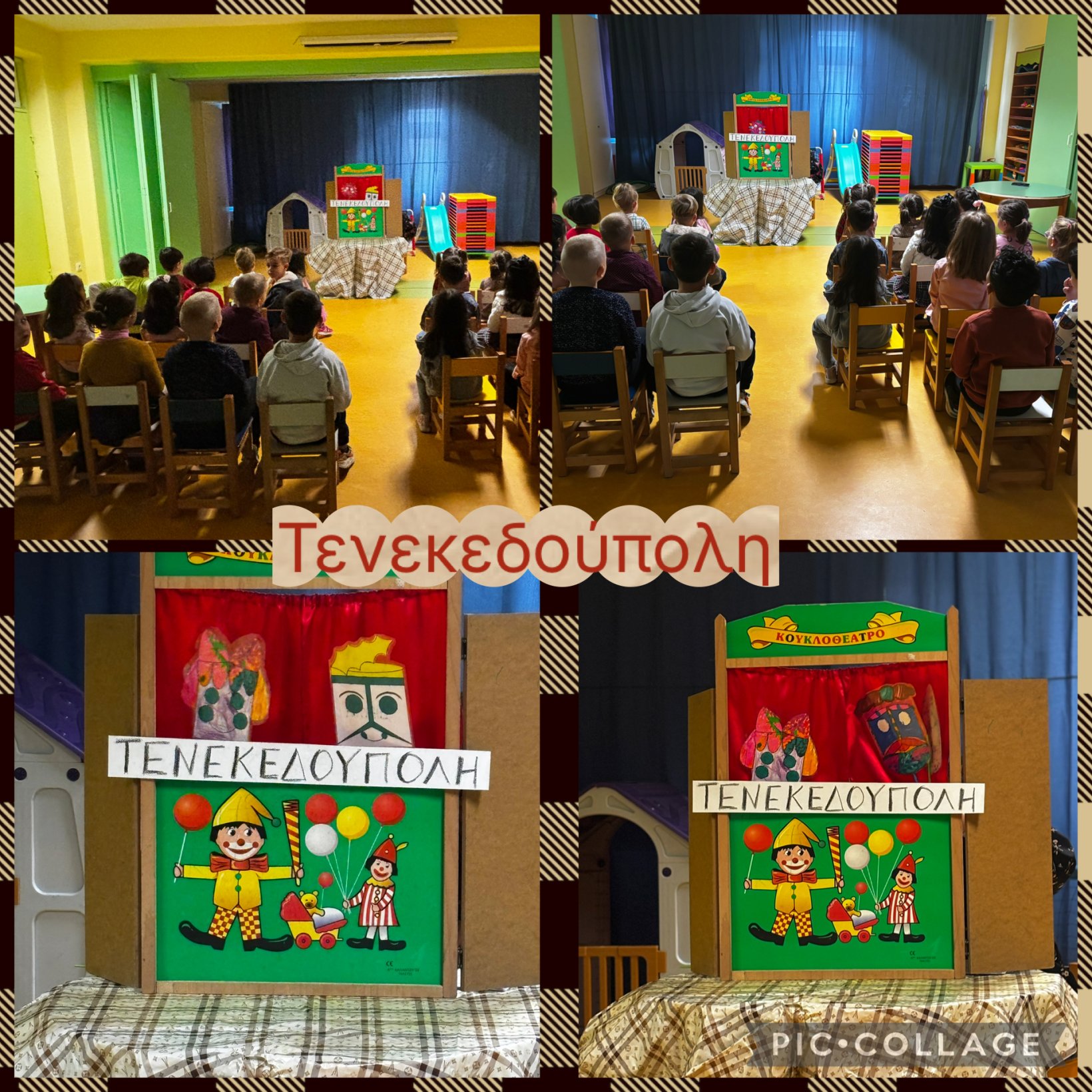 Τα νήπια παρακολούθησαν παράσταση κουκλοθεάτρου από τις εκπαιδευτικούς του Νηπιαγωγείου και μυήθηκαν στις  αξίες της Δημοκρατίας , της Δικαιοσύνης και της Ελευθερίας, μέσα από τους ήρωες της Τενεκεδούπολης.