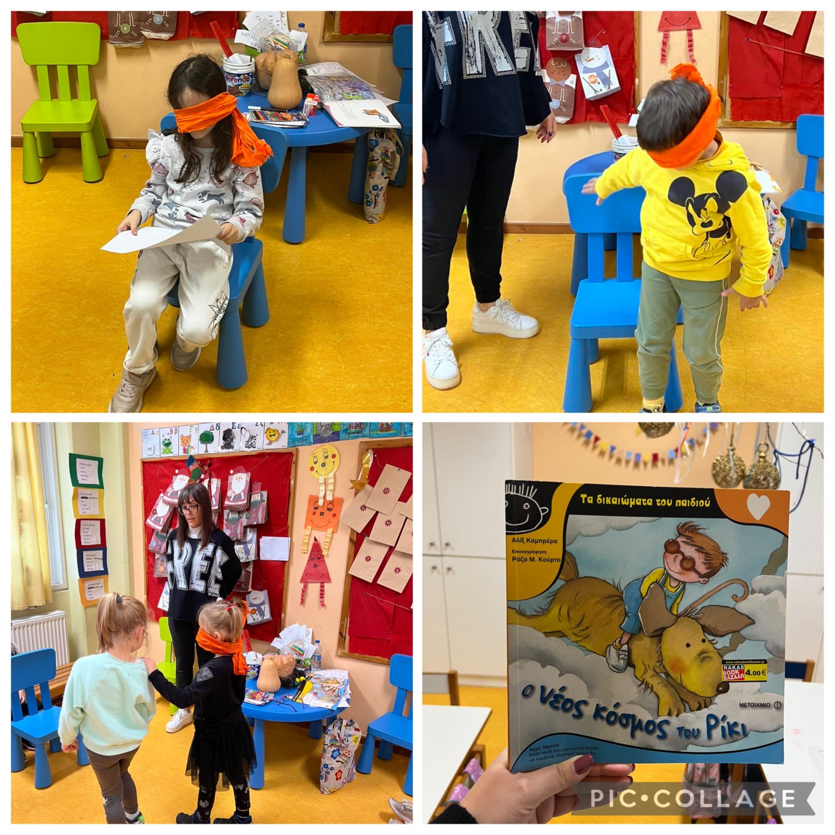 Αργότερα, αφού διαβάσαμε το παραμύθι με τον Ρίκι, ακολούθησε μια σειρά δραστηριοτήτων ενσυναίσθησης και ευαισθητοποίησης των παιδιών. Ξεκινήσαμε με προβλήματα όρασης . Τα νήπια προσπάθησαν με μια σειρά κινητικών παιχνιδιών να μπουν στην θέση των ατόμων με προβλήματα όρασης.