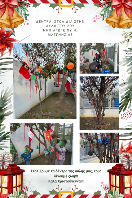 Το Νηπιαγωγείο μας συμμετείχε στην περιβαλλοντική δράση  με τίτλο “ΔΕΝΤΡΑ ΣΤΟΛΙΔΙΑ ΣΤΗΝ ΑΥΛΗ ΜΑΣ”  που οργανώνει η Πρωτοβάθμια Εκπαίδευση Δυτικής Θεσσαλονίκης  δια της υπευθύνου της ,κυρίας Ιππέκη Βασιλικής , την οποία ευχαριστούμε θερμά για την ακούραστη ενημέρωση και ενθάρρυνση σε όλες τις περιβαλλοντικές δράσεις που «τρέχουν» και εφέτος. Τα παιδιά μας ετοίμασαν στολίδια με φυσικά υλικά με τα οποία στολίσαμε τα δέντρα της αυλής μας!