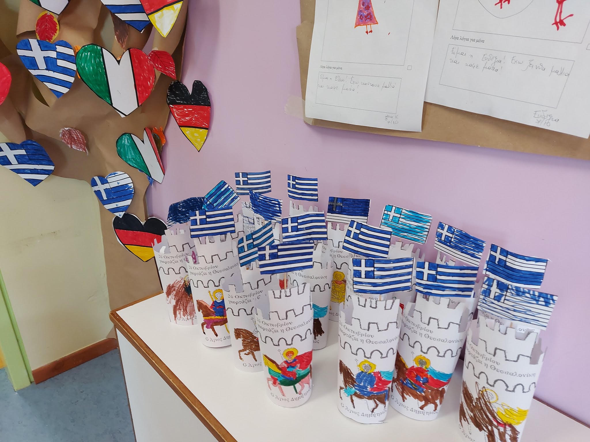 Τα παιδιά μας συμμετείχαν στο εορταστικό κλίμα των ημερών, δημιουργώντας κατασκευές όπως αυτή του Λευκού Πύργου, συμβόλου της πόλης μας και κάνοντας παρέλαση στην αυλή του σχολείου μας.