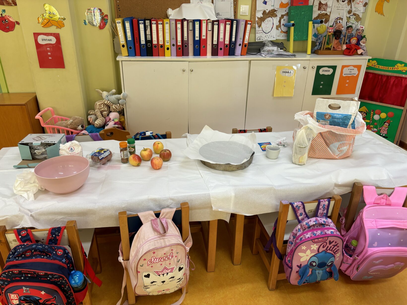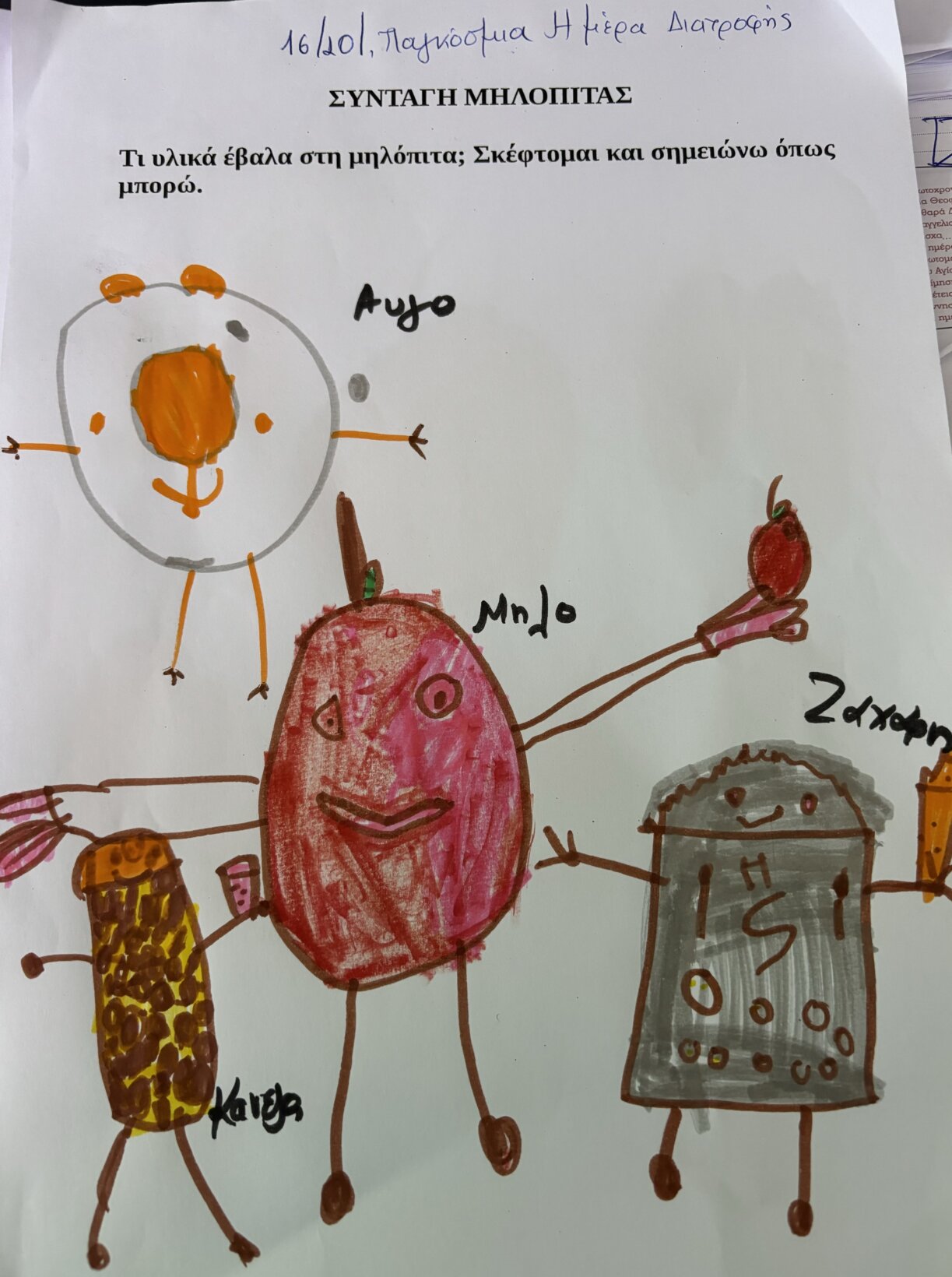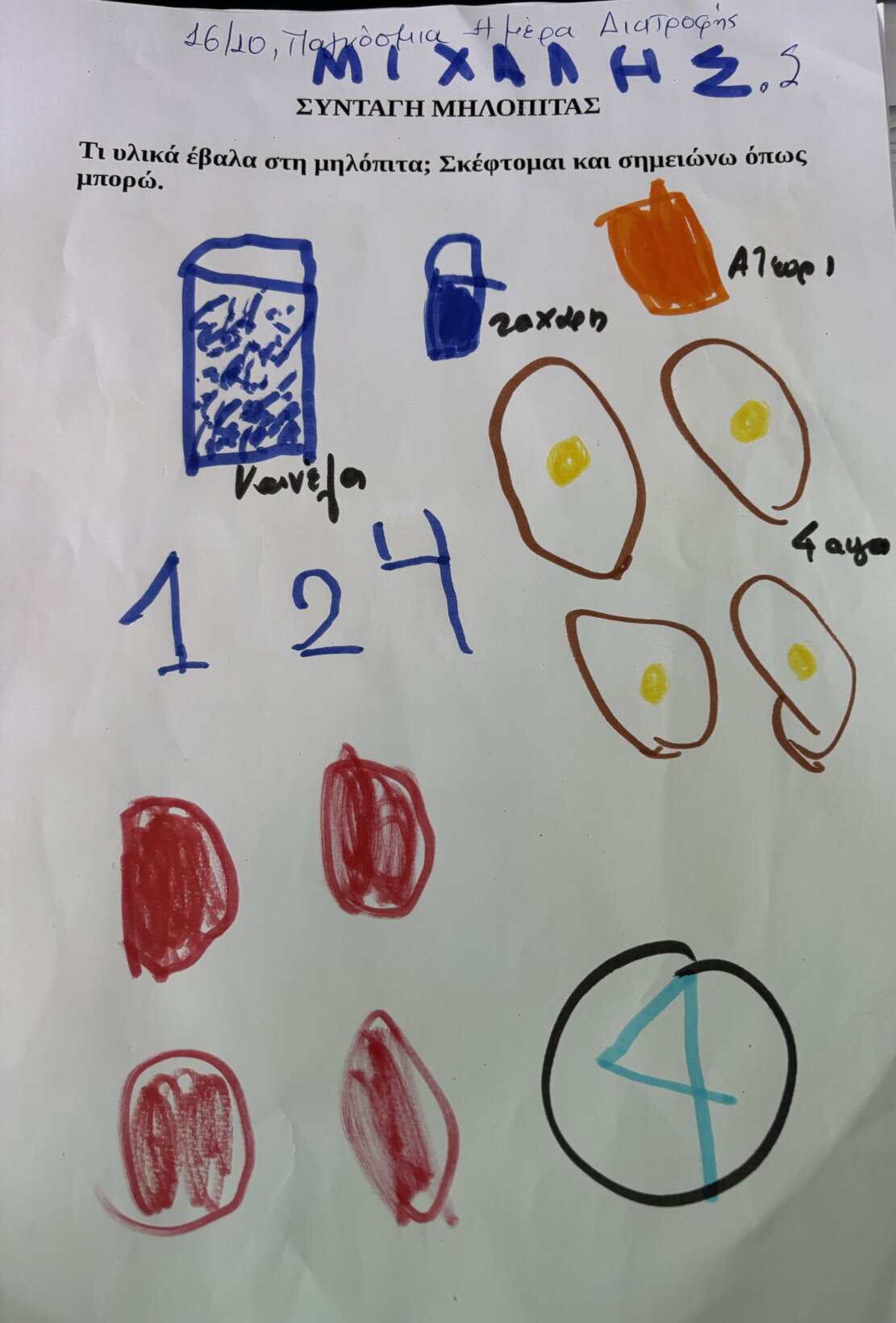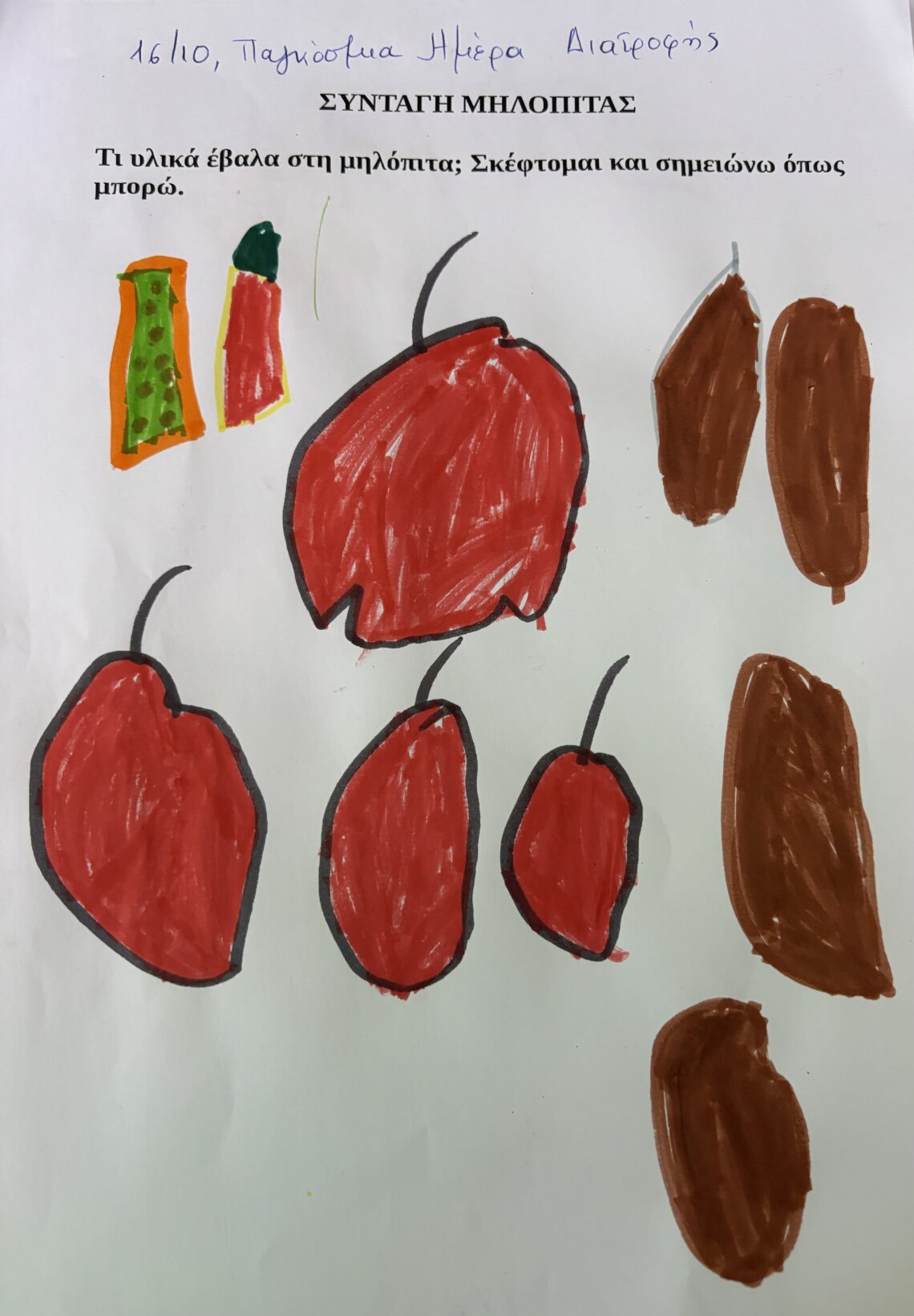 3f5b9ffee691d9c5a16208e431b0da1aΤην Τετάρτη, 16 Οκτωβρίου ,με αφορμή την Παγκόσμια ημέρα διατροφής, τα νήπια και των τριών τμημάτων, ασχολήθηκαν με θέματα υγιεινής διατροφής μέσα από εκπαιδευτικά βίντεο , ομαδικές αφίσες που έφτιαξαν και συζητήσεις που αναπτύχθηκαν μέσα στην ομάδα. Έγιναν chef για μια μέρα , φτιάχνοντας μηλόπιτα  με αφορμή κ την  θεματική των φθινοπωρινών φρούτων. Σημείωσαν τη συνταγή, με τον δικό τους μοναδικό τρόπο, ως προστιθέμενη αξία  της δραστηριότητας .Ακολουθεί ενδεικτικό φωτογραφικό υλικό από την ημέρα!