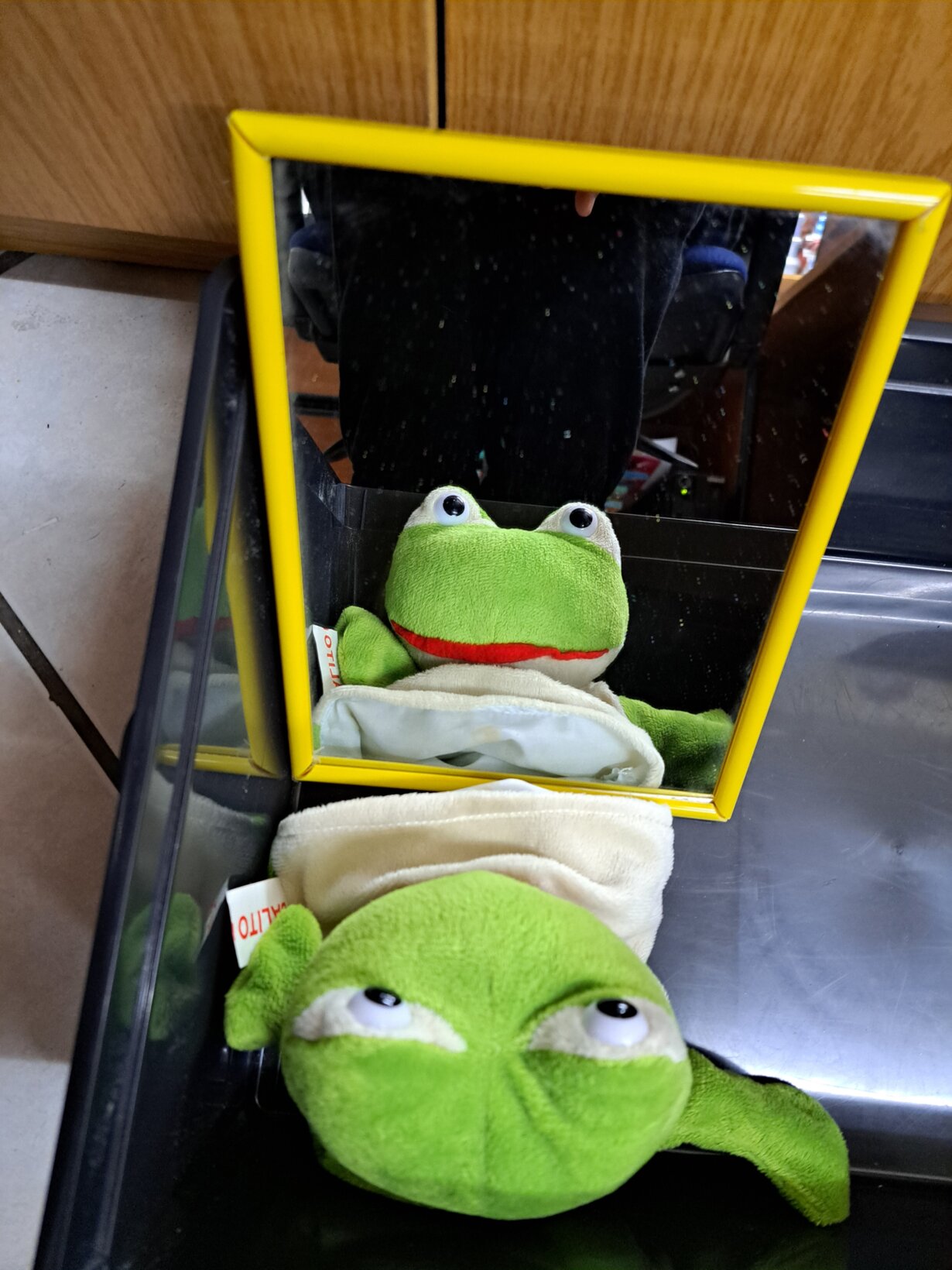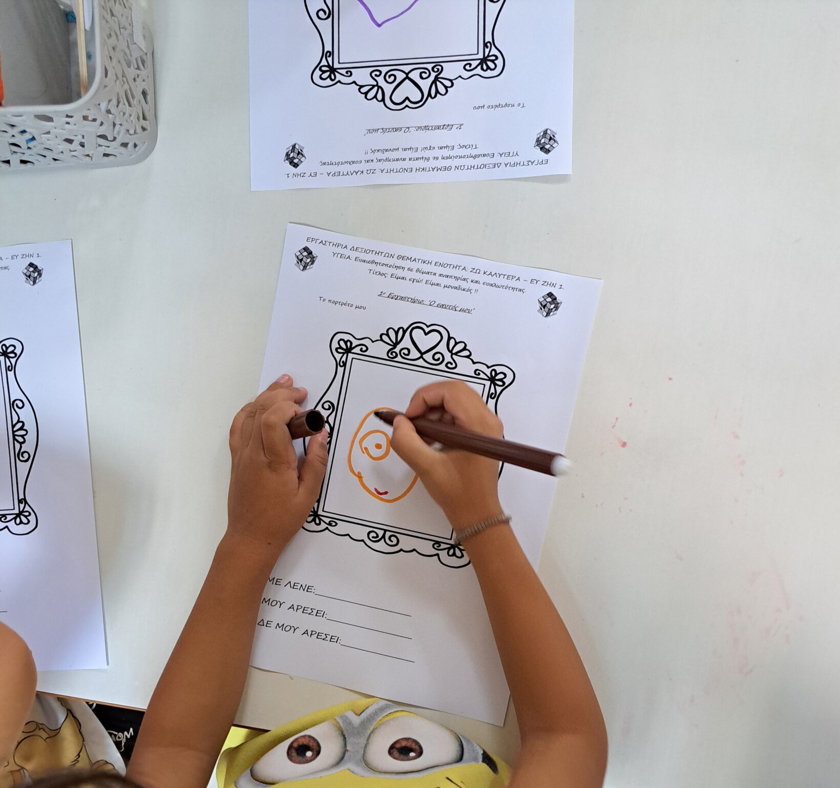 Ο Πιπ το βατραχάκι και η μασκότ της τάξης, μας έφερε μία έκπληξη. Έναν καθρέφτη. Παροτρύνουμε τα παιδιά το καθένα χωριστά να μιλήσει για τον εαυτό του και να τον περιγράψει. Αναφερόμαστε στα εξωτερικά μας χαρακτηριστικά αυτά που βλέπουμε στον καθρέφτη, εστιάζουμε στις ομοιότητες αλλά και τις διαφορές. Ζωγραφίζουμε το πορτρέτο μας, τι μας αρέσει και τι όχι. Εν συνεχεία μιλάμε για τα εσωτερικά μας χαρακτηριστικά και τι ξεχωρίζει στον χαρακτήρα του καθενός.