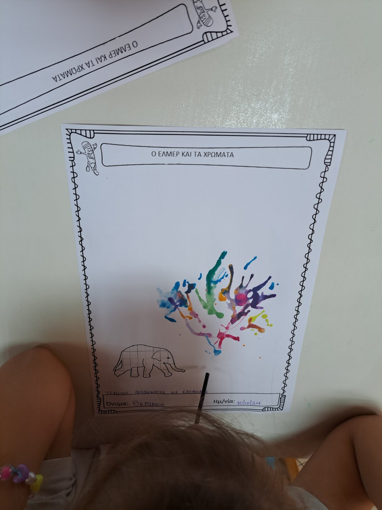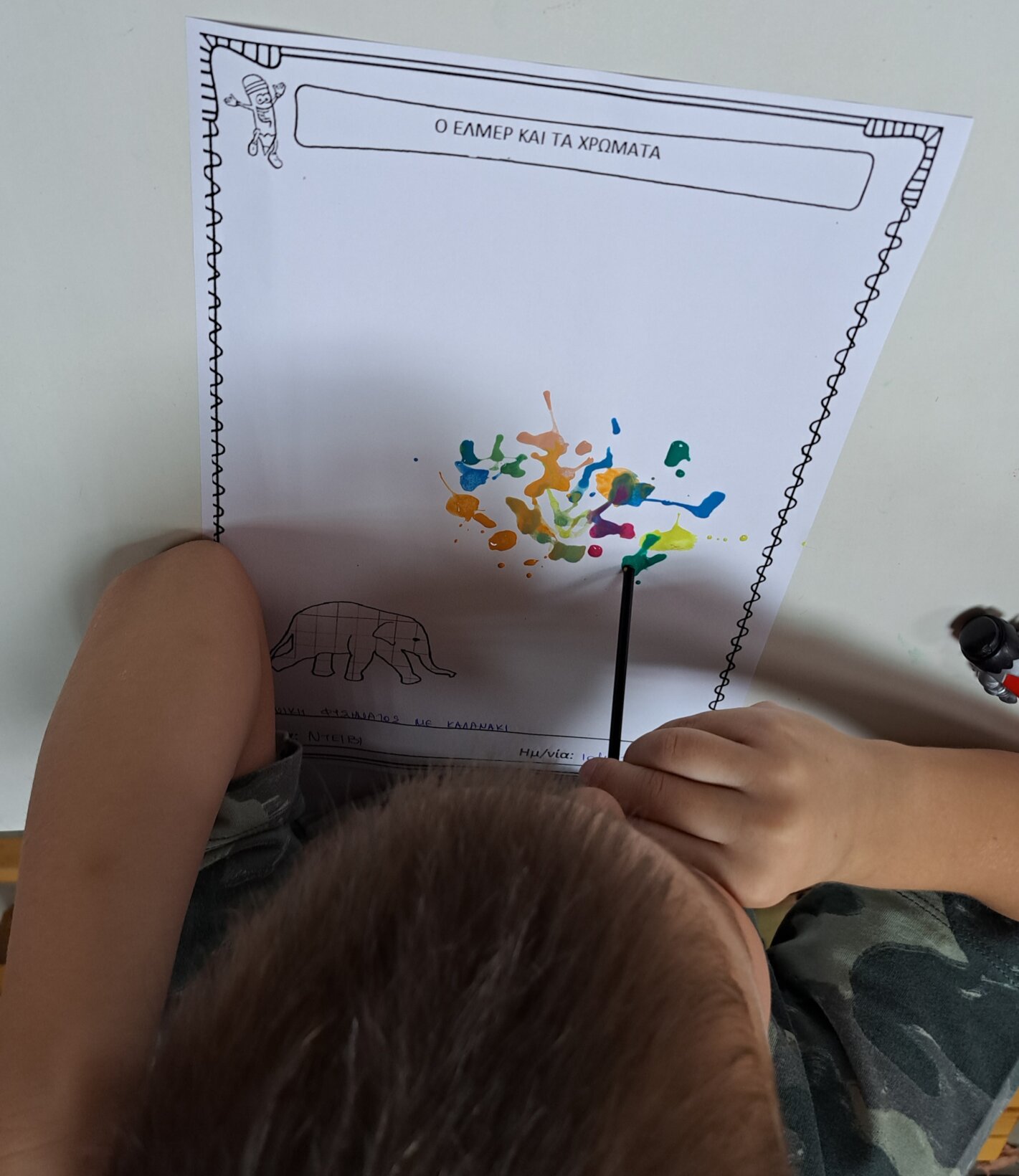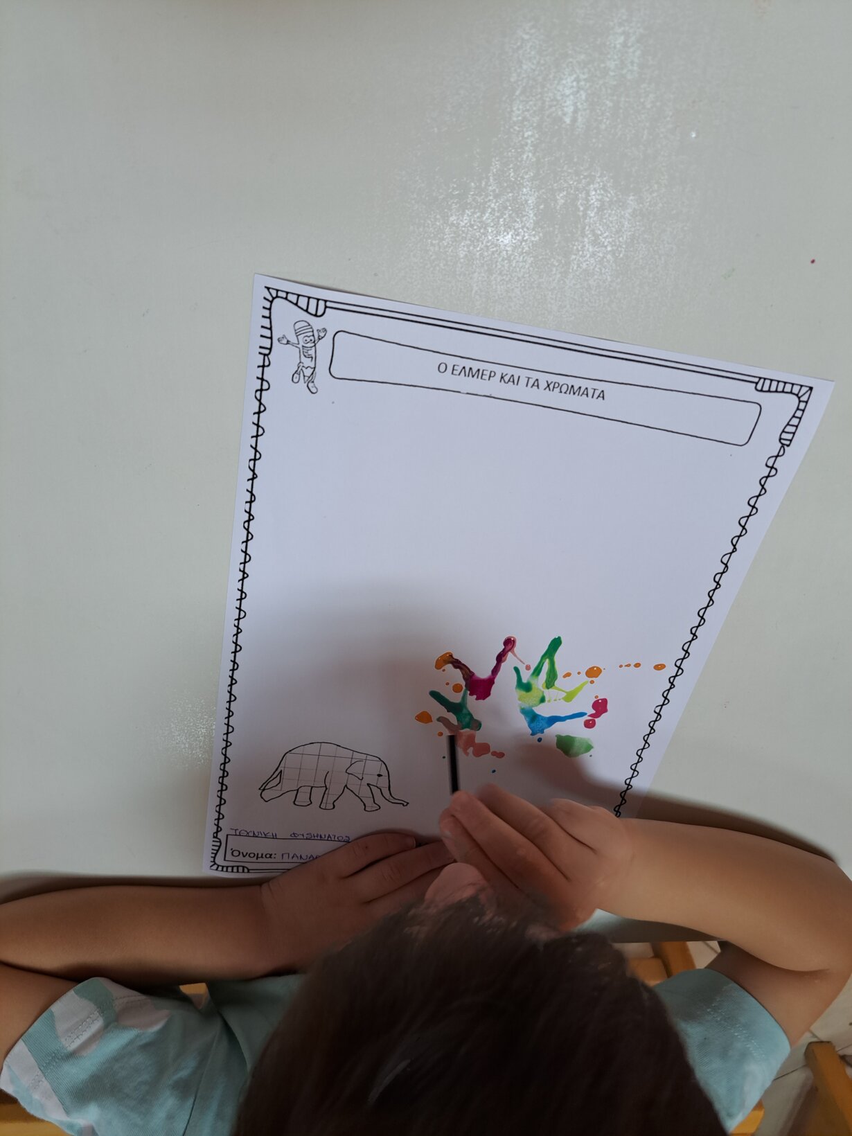 Διαβάζουμε το παραμύθι ‘΄Ελμερ’ του Ντέιβιντ Μακ Κι. Συζητάμε για το Τι νιώθει ο Έλμερ; Ζωγραφίζουμε τις σκέψεις και τα συναισθήματά του. Ευκαιρία να κάνουμε και την τεχνική φυσήματος με καλαμάκι που ενθουσίασε τα παιδιά.