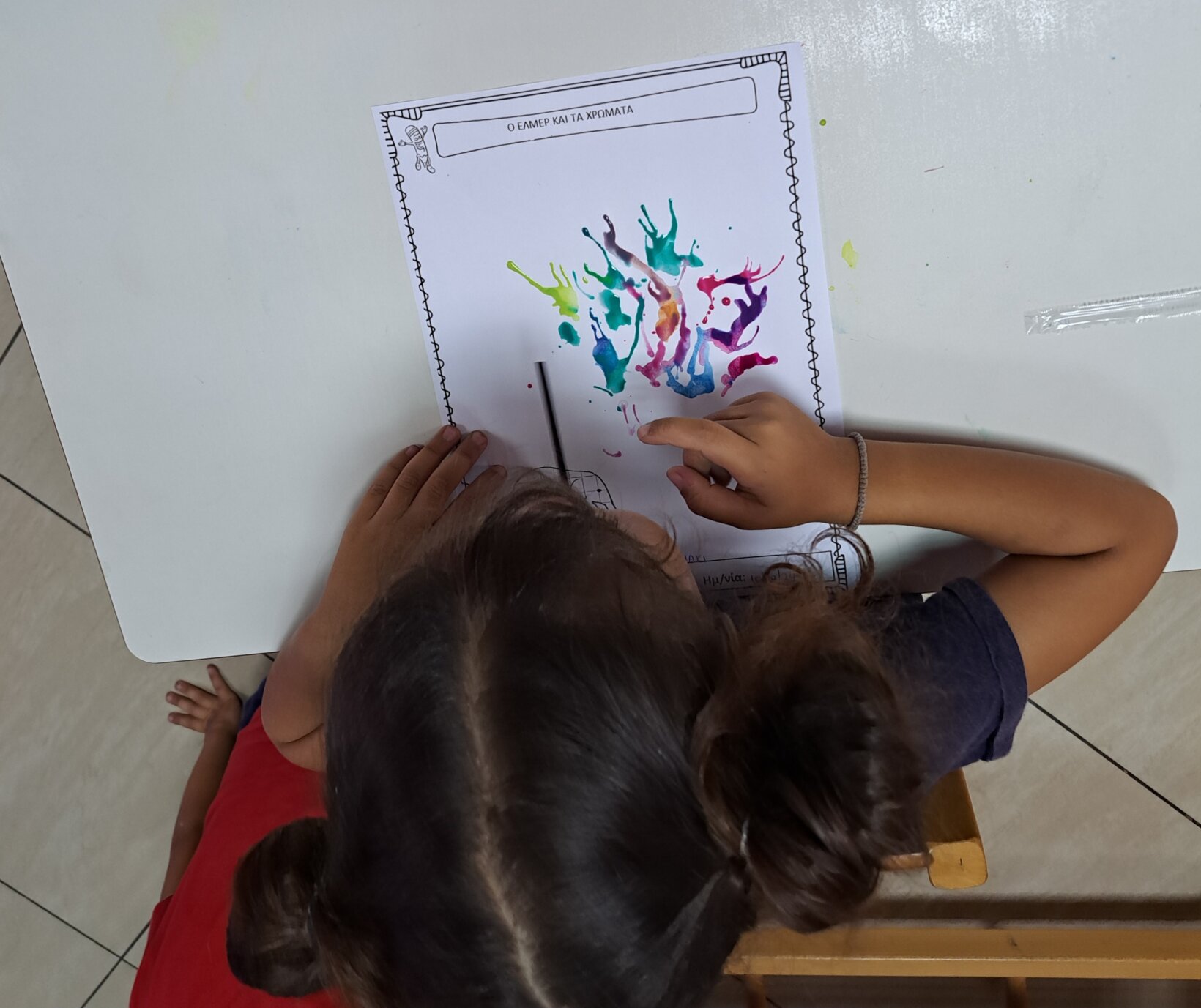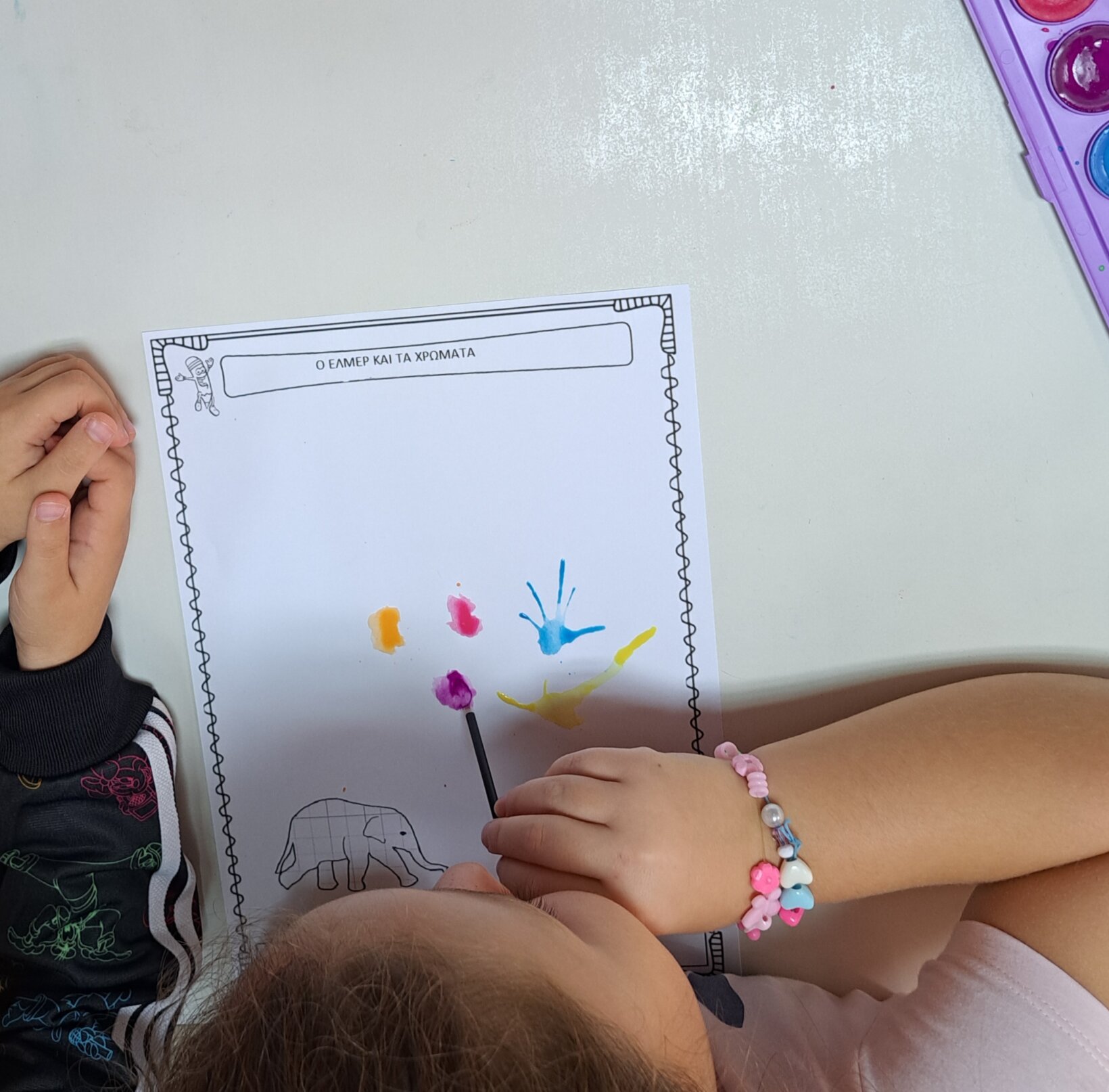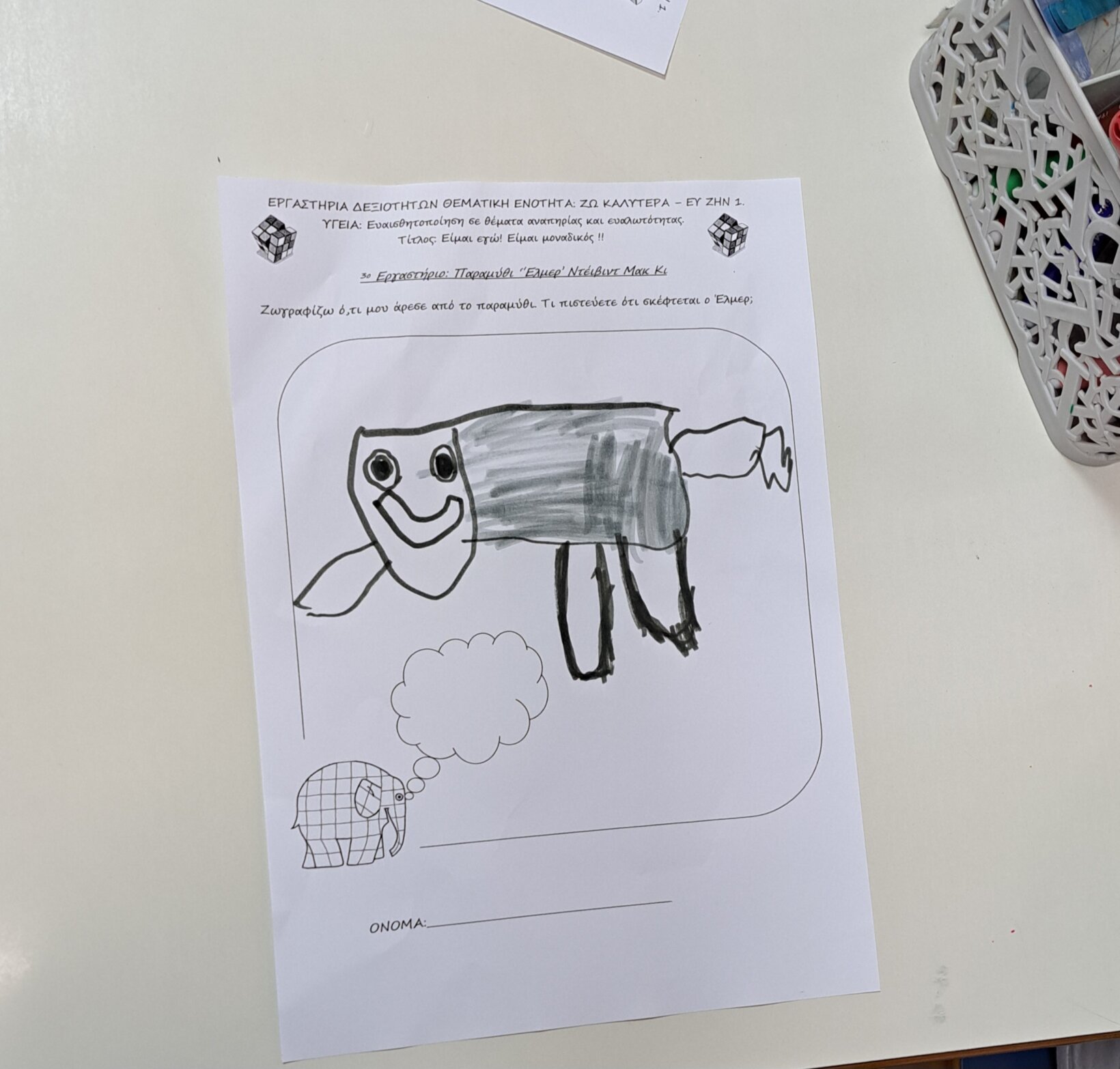 Διαβάζουμε το παραμύθι ‘΄Ελμερ’ του Ντέιβιντ Μακ Κι. Συζητάμε για το Τι νιώθει ο Έλμερ; Ζωγραφίζουμε τις σκέψεις και τα συναισθήματά του. Ευκαιρία να κάνουμε και την τεχνική φυσήματος με καλαμάκι που ενθουσίασε τα παιδιά.