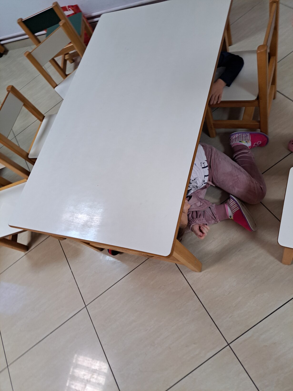 Κάνουμε άσκηση σεισμού. Οι ασκήσεις γίνονται καθ’ όλη τη διάρκεια του χρόνου για να βρίσκονται σε ετοιμότητα τα νήπια και να μη νιώθουν πανικό. Ασκήσεις για πριν, για μετά και που πάμε ώστε να είμαστε προφυλαγμένοι. Ενδιαφέρον υλικό έχει και στο