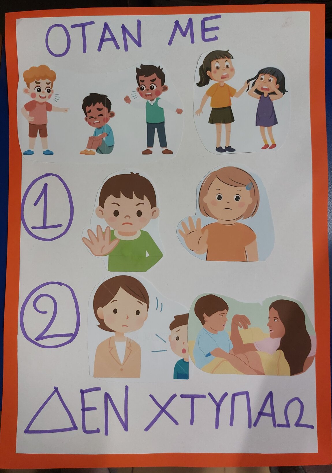 Στη συνέχεια οι δασκάλες έθεσαν το ερώτημα του πώς πρέπει να φερθούν τα παιδιά αν κάποιο άλλο παιδί τους ενοχλεί ή τους χτυπάει και πώς πρέπει να φερθούν τα παιδιά αν δουν κάποιο άλλο παιδί να το ενοχλούν ή να το χτυπάνε. Από τις συζητήσεις προέκυψαν δυο οδηγοί με απλά βήματα για να τα θυμούνται όλοι!
