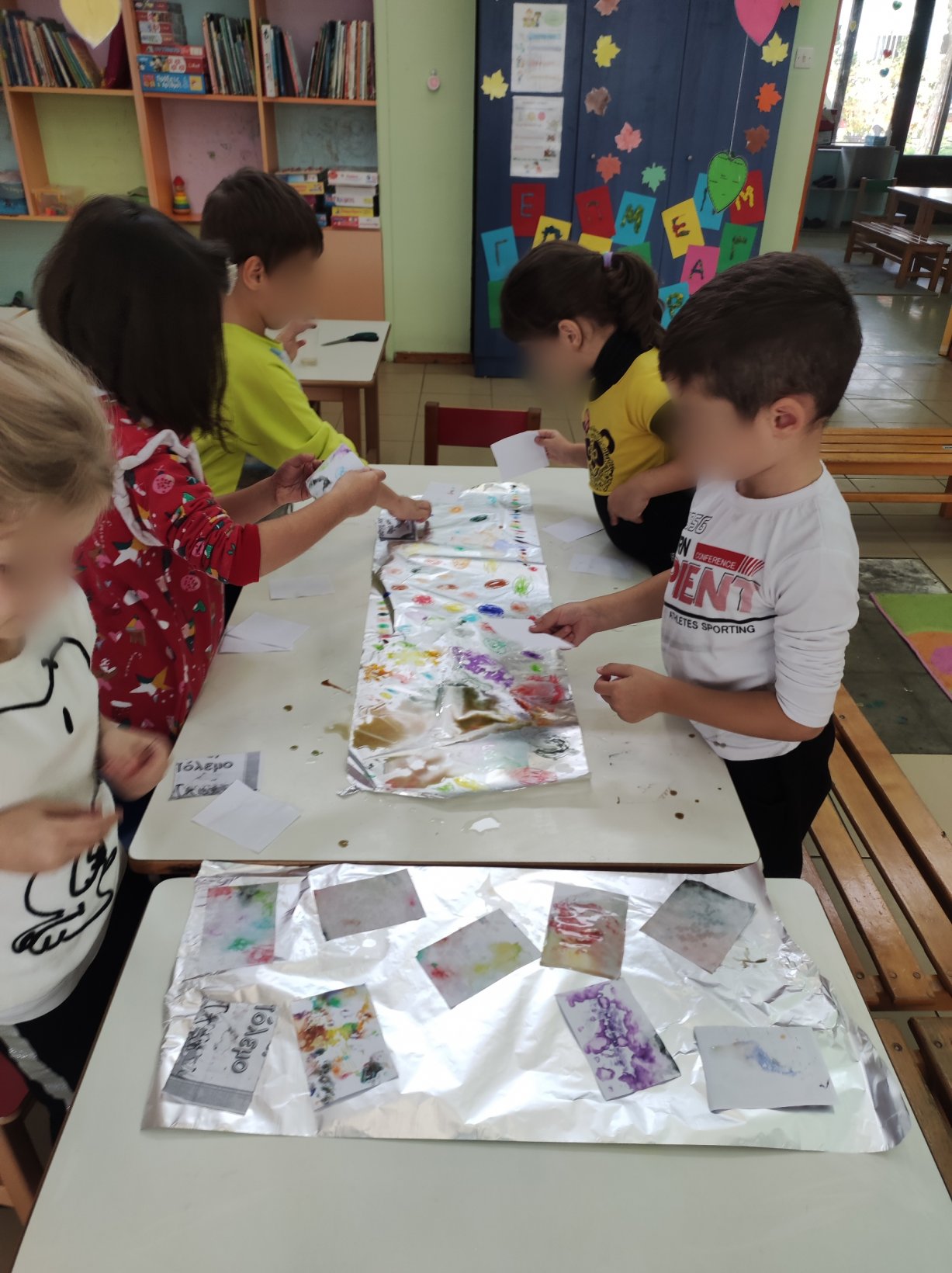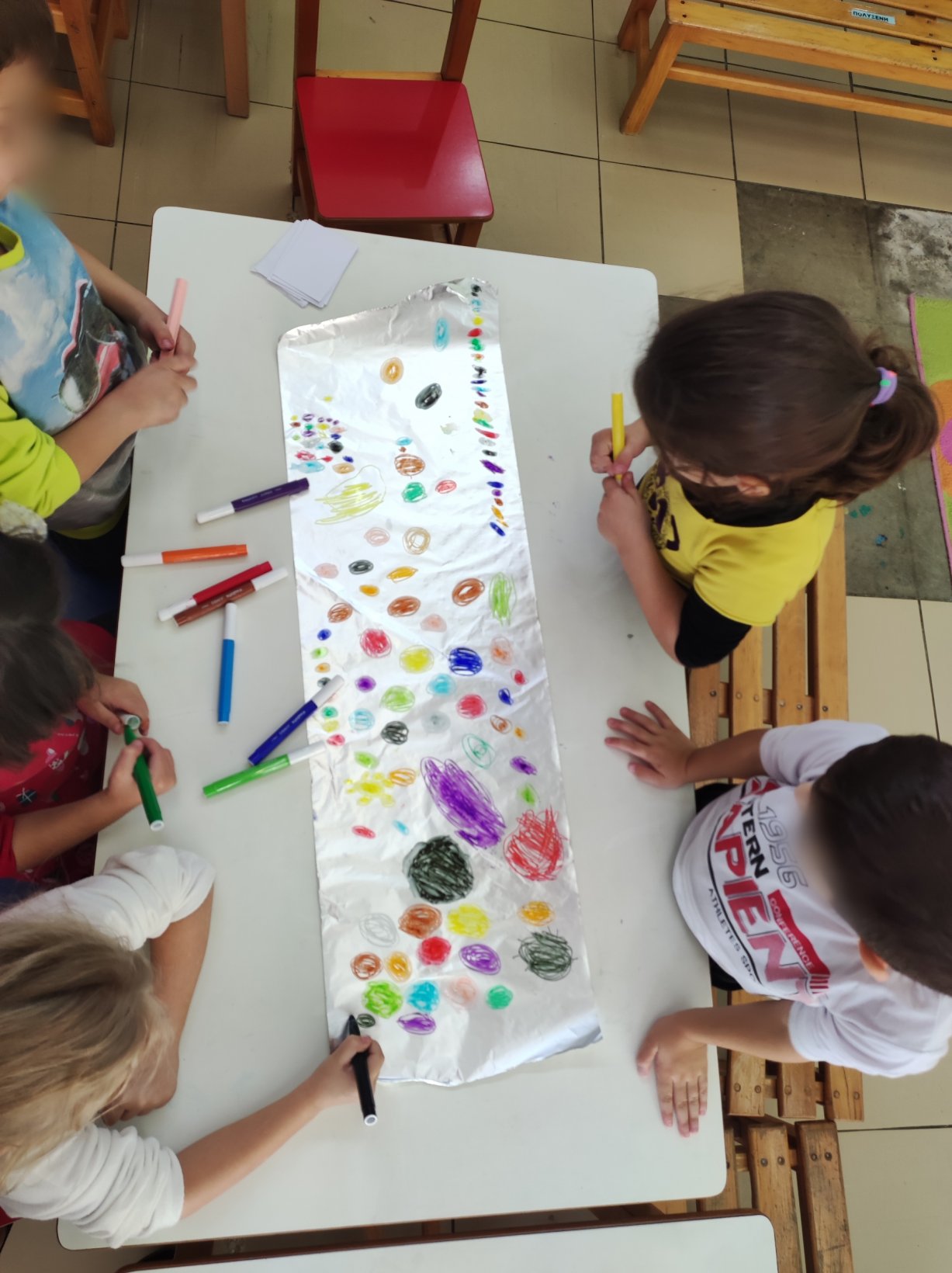 Πειραματιστήκαμε ζωγραφίζοντας με μαρκαδόρους, κύκλους πάνω σε αλουμινόχαρτο.