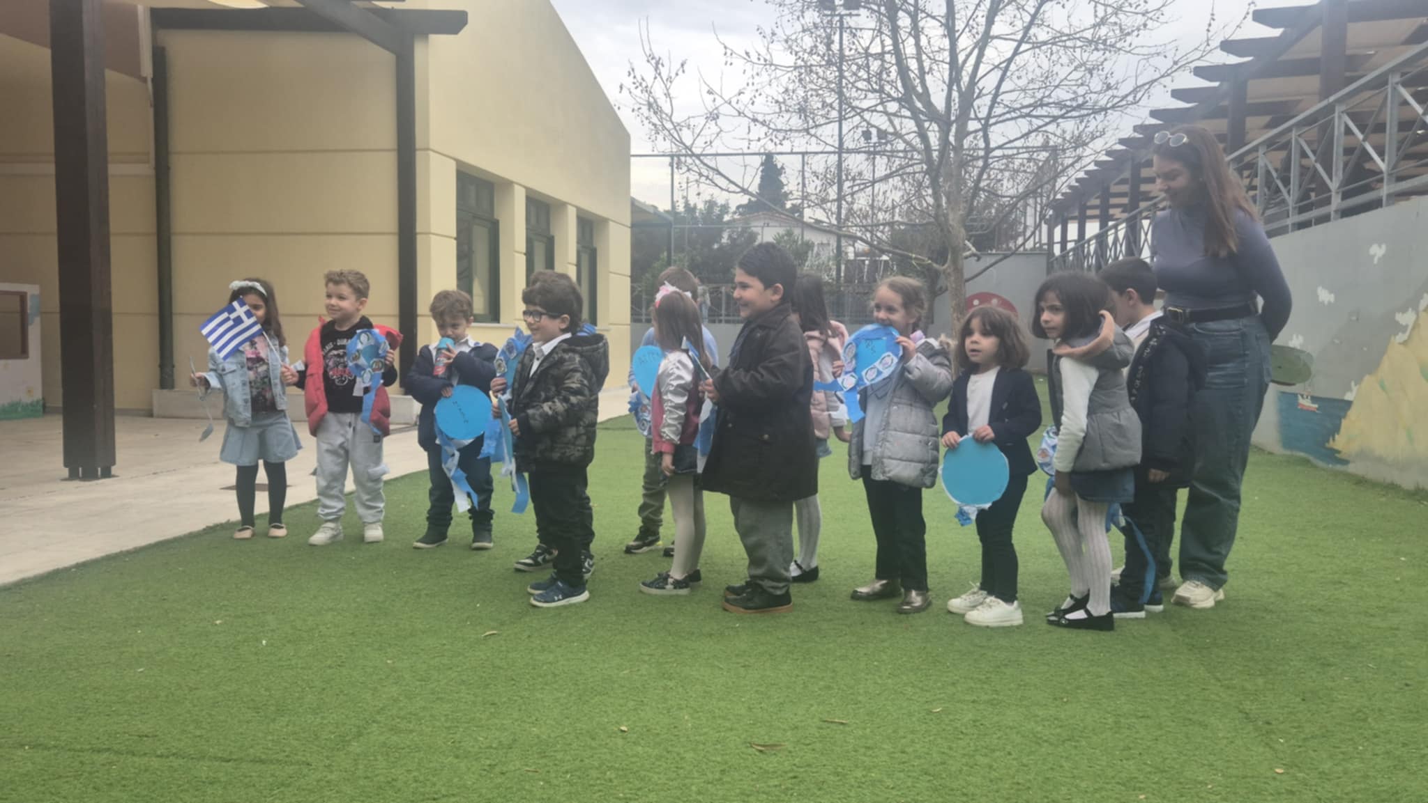 Τέλος, η γιορτή μας έκλεισε με την παρέλαση των παιδιών στον προαύλιο χώρο του Νηπιαγωγείου και την απαγγελία του Εθνικού Ύμνου, εξυμνώντας την αξία της ελευθερίας, στο βωμό της οποίας θυσιάστηκαν οι ήρωες του 1821!