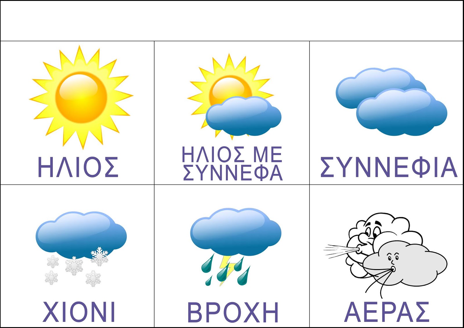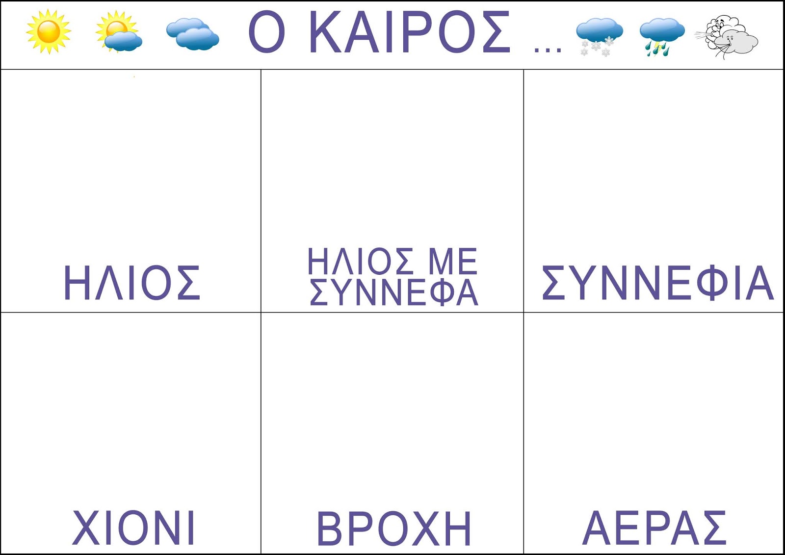 Η μορφή της κάρτας του καιρού είναι η παρακάτω. Το παιδί μπορεί καθημερινά παρατηρώντας από το παράθυρο να βάζει τον αντίστοιχο καιρό της ημέρας στην καρτέλα που αφορά τον σημερινό καιρό.