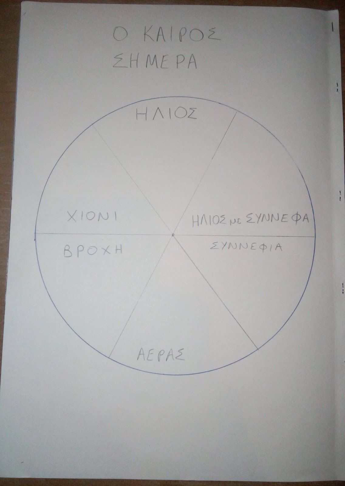 Βήμα 2ο : Βρίσκουμε το κέντρο του κύκλου,χωρίζουμε τον κύκλο σε έτσι κομμάτια και βάζουμε τίτλο (π.χ. Ο ΚΑΙΡΟΣ ΜΑΣ ΣΗΜΕΡΑ).