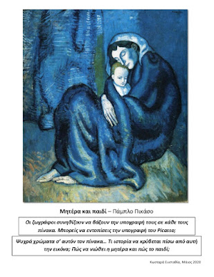 Παρατήρησε τα χρώματα, είναι χαρούμενα; Τι μπορεί να σκέφτεται η μαμά; Τι σκέφτεται το παιδί; Τι ιστορία κρύβεται πίσω από την εικόνα; (Συζήτηση με το παιδί – μπορείτε να αναζητήσετε στο ίντερνετ πληροφορίες και έργα του Πικάσο με τα παιδιά τα πλαίσια της συζήτησης)