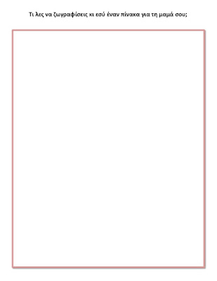 - Δραστηριότητα : Κατεβάζοντας την παρακάτω εικόνα ή σε λευκό χαρτί ζητάμε από το παιδί να κάνει έναν πίνακα για την ΜΑΜΑ. Ρωτάμε το παιδί αν θέλει να ευχηθεί κάτι στην μαμά κι αν θέλει να το γράψει πάνω στην ζωγραφιά, το γράφουμε σε ένα χαρτί και με την βοήθειά μας μπορεί να το αντιγράψει). Γράφουμε όνομα και ημερομηνία πριν το χαρίσουμε στην μαμά!