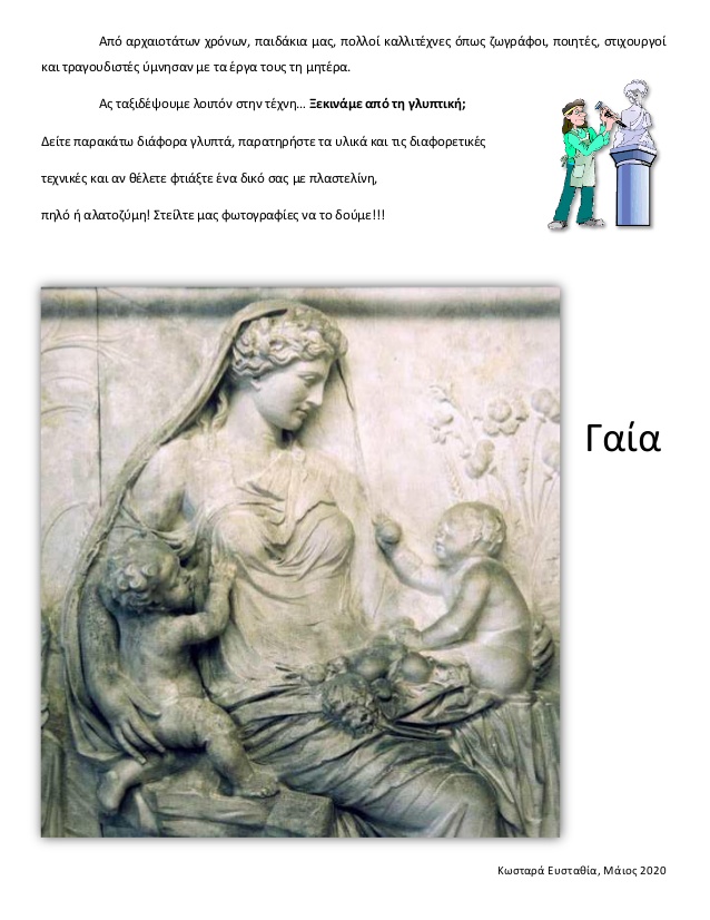 - Δραστηριότητα : Βλέπουμε την εικόνα με τα παιδιά, συζητάμε για το τι βλέπουν. Είναι κάτι που βλέπουμε στην σημερινή εποχή; Θα μπορούσαμε με πλαστελίνη να πλάσουμε ένα ανάλογο έργο;;