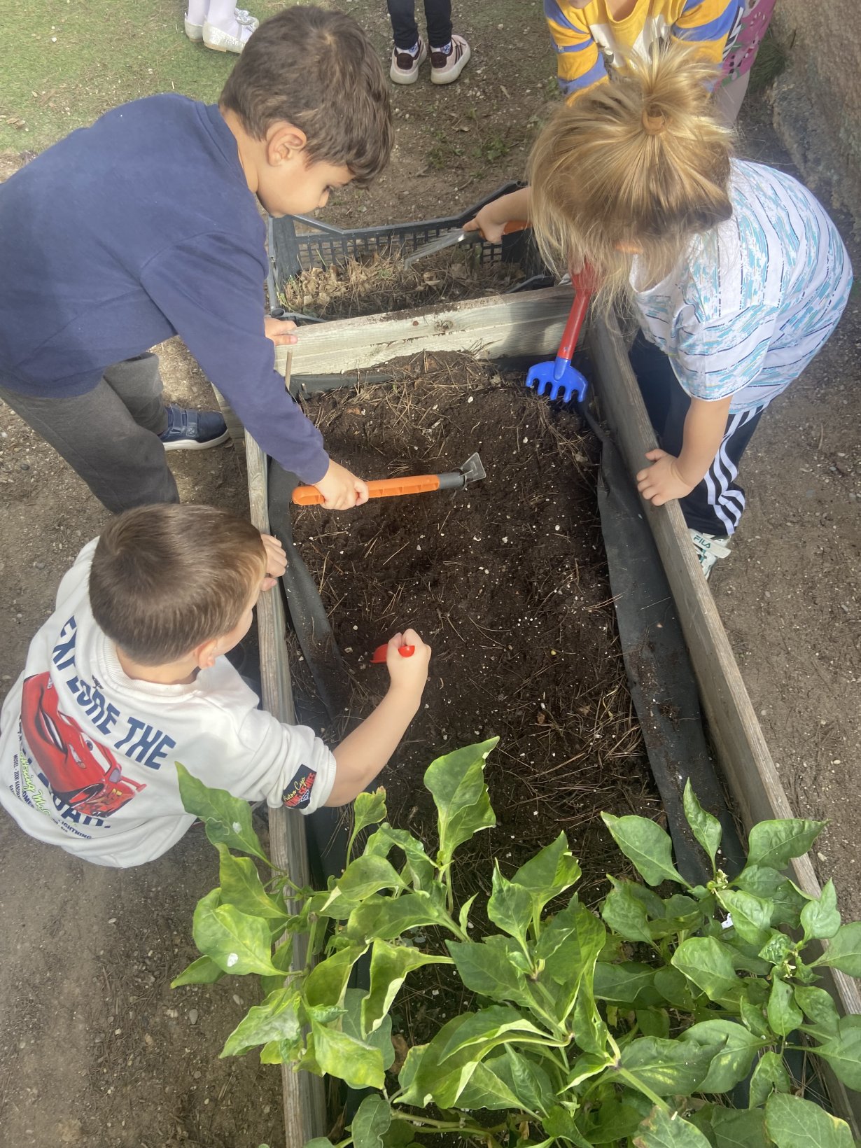 Στην αρχή της σχολικής χρονιάς προετοιμάσαμε το χώμα μας για να δεχθεί τα νέα φυτά. Για το λόγο αυτό βάζαμε τις φλούδες από τα φρούτα μας μέσα στο χώμα σαν φυσικό λίπασμα. Κάναμε δηλαδή κομποστοποίηση.