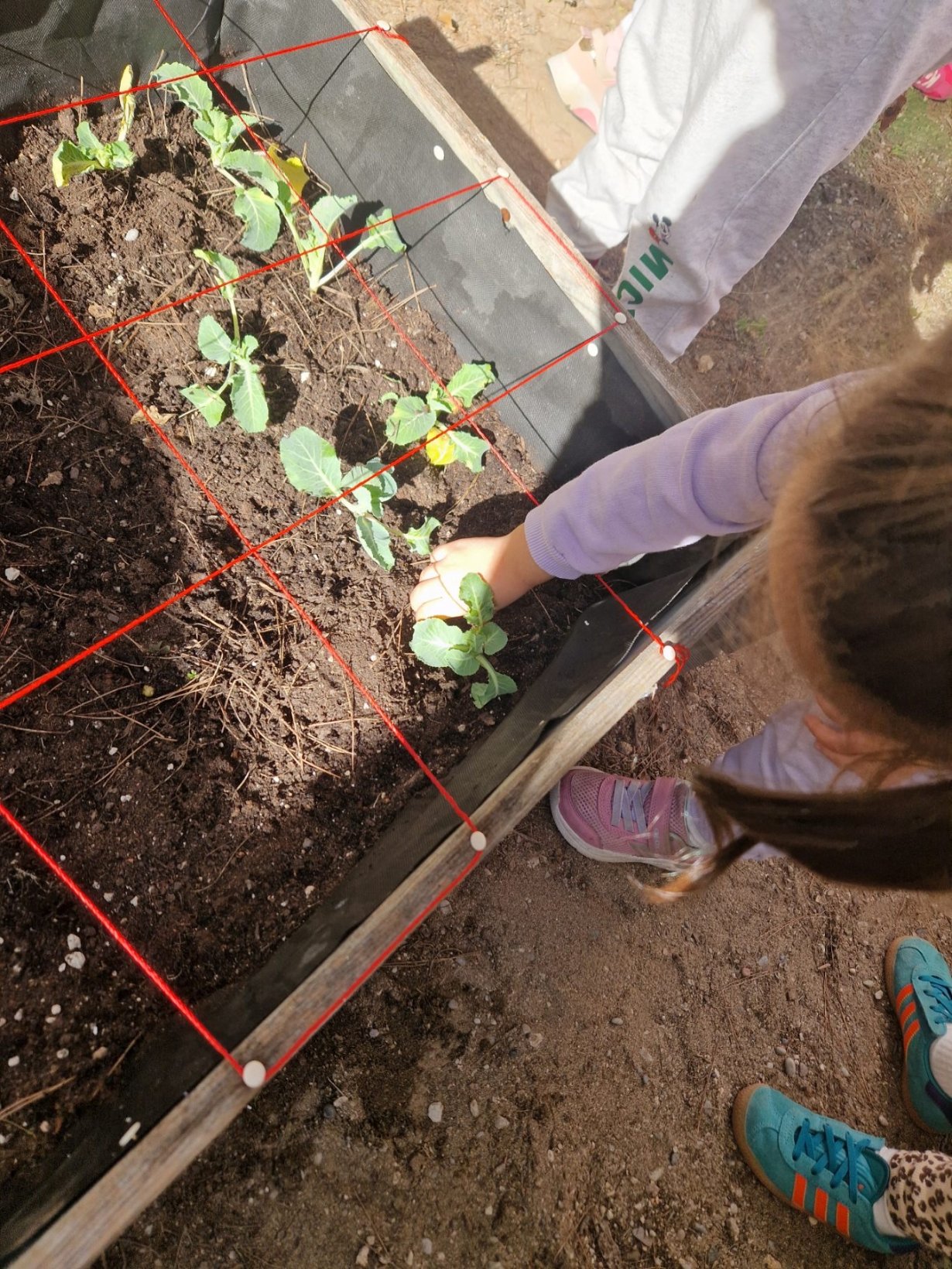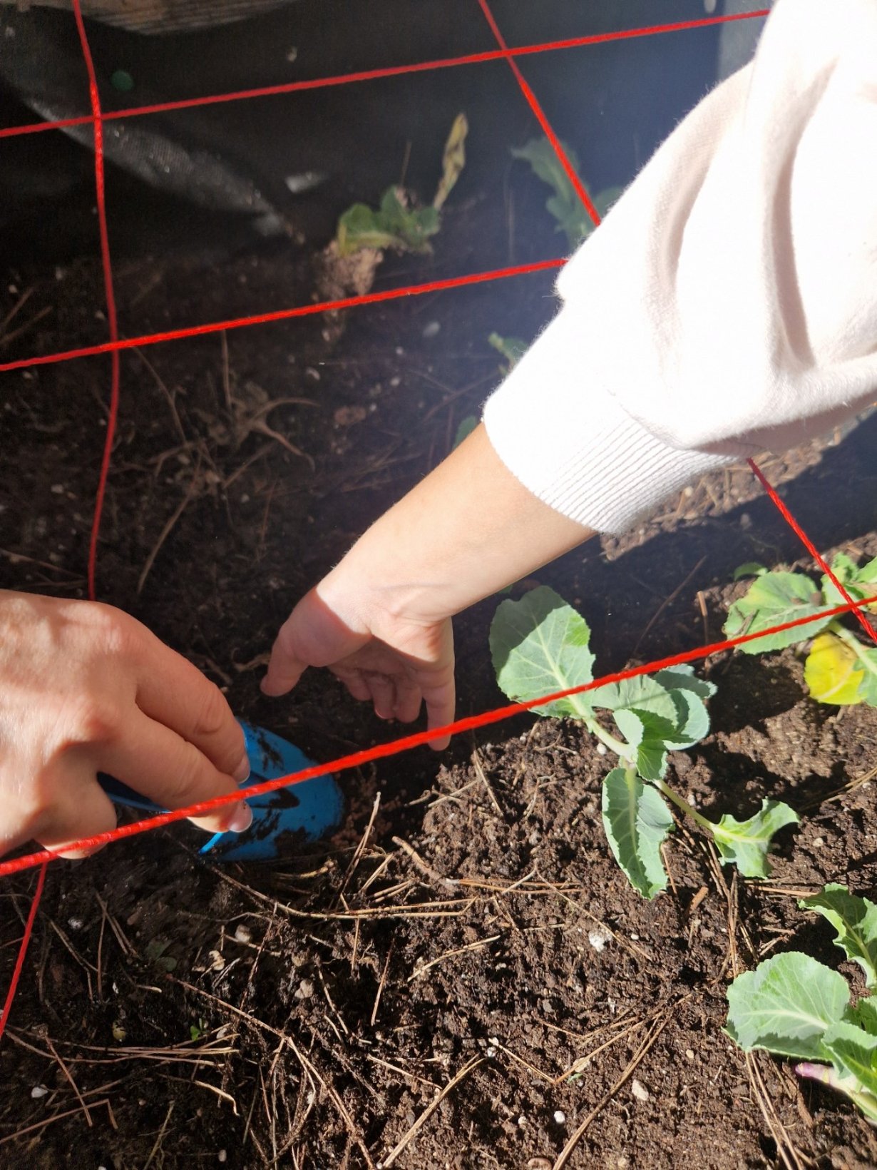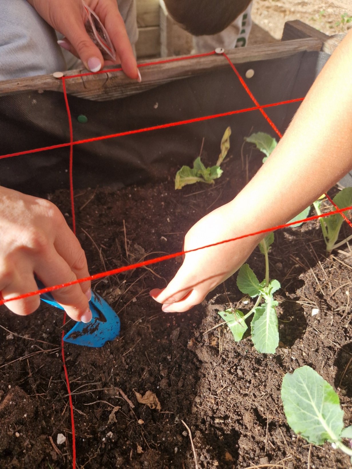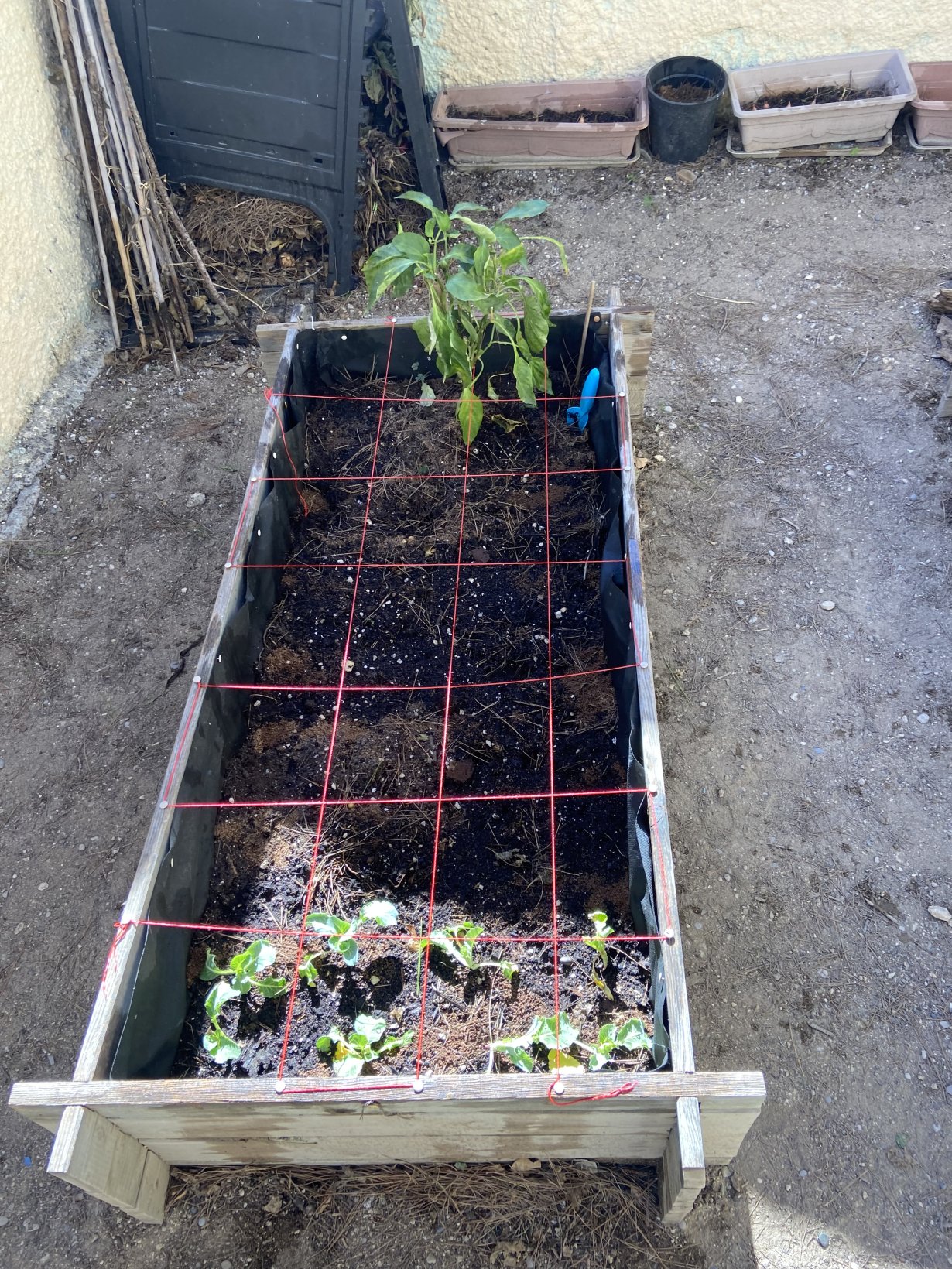και χωρίσαμε με τη βοήθεια σπάγγου τα παρτέρια σε ίσα κουτάκια για να έχει το κάθε μαρουλάκι το χώρο του να μεγαλώσει!
