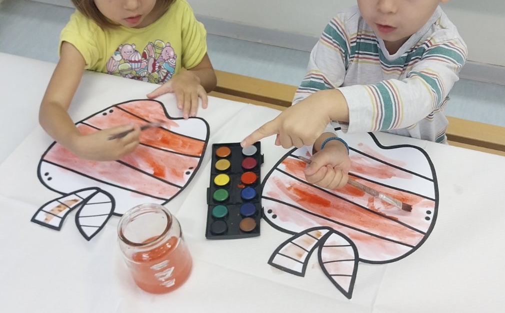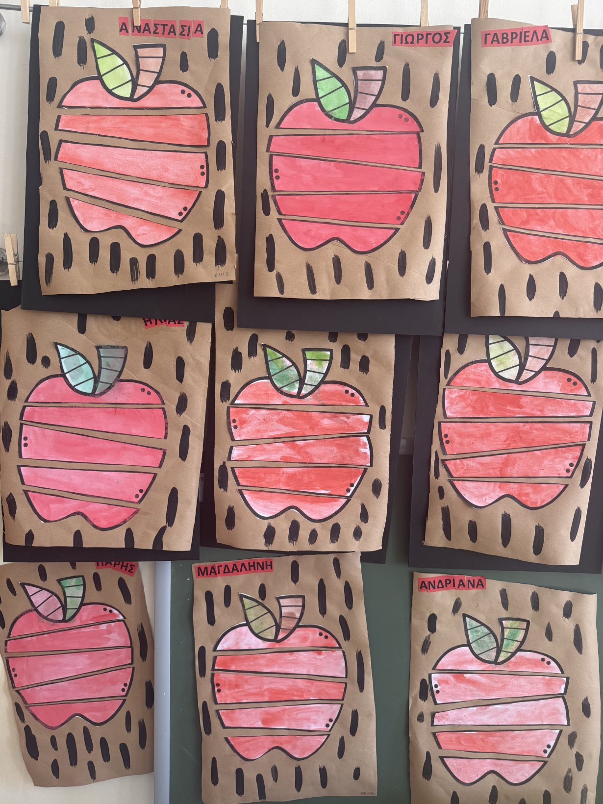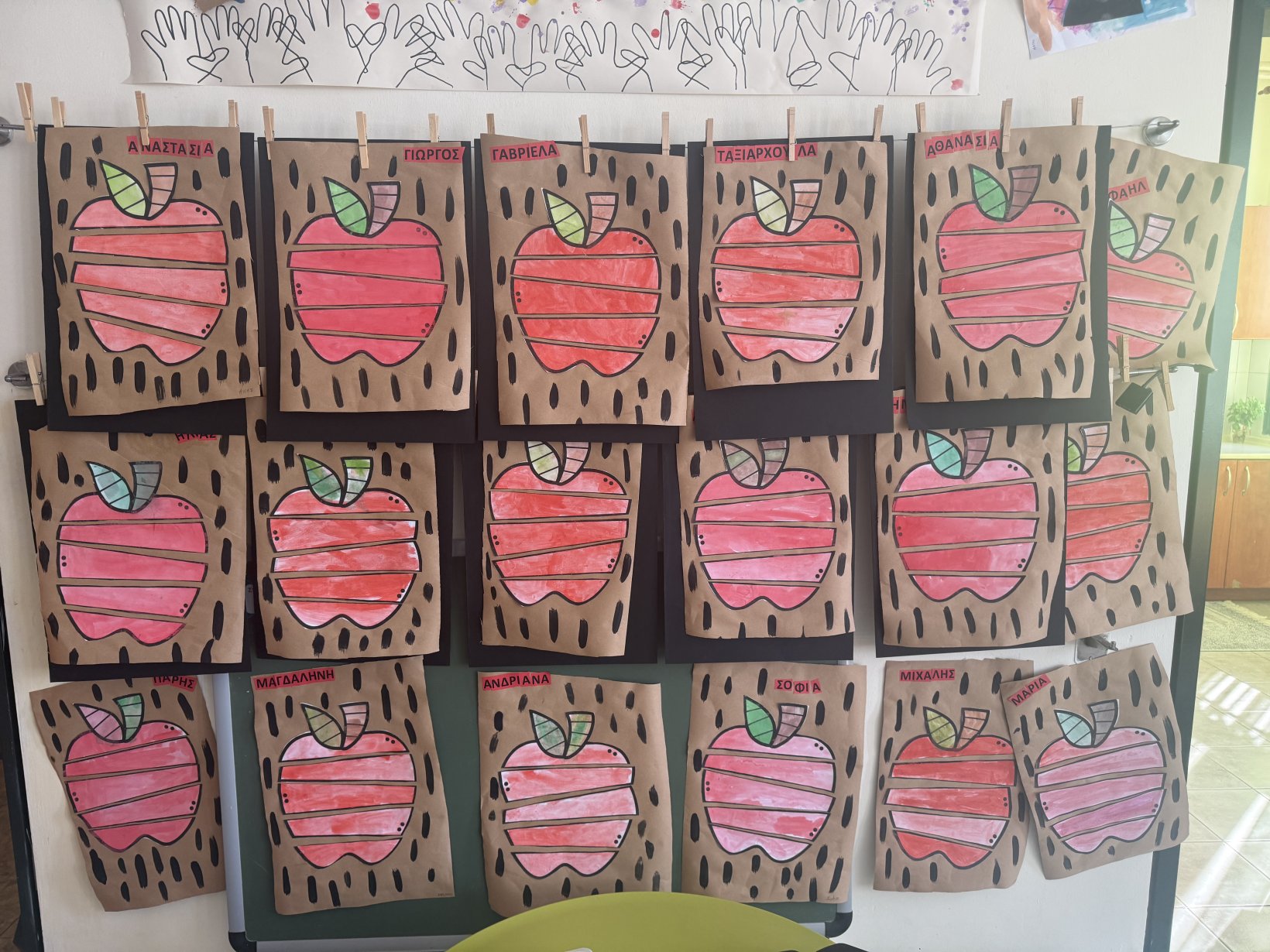 Αρχικά χρωμάτισαν μήλα με νερομπογιά και εν συνεχεία η εκπαιδευτικός τα έκοψε σε οριζόντια κομμάτια ώστε να δημιουργηθεί ένα παζλ. Τα παιδιά κλήθηκαν να το φτιάξουν και να το κολλήσουν δημιουργώντας και πάλι το μήλο (STEM).