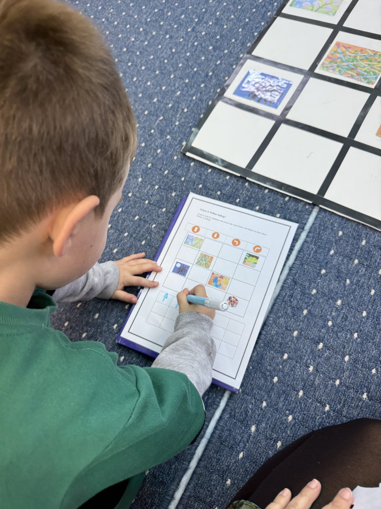 Η δεύτερη δραστηριότητα είχε τίτλο “Where is Wilbur hiding?” και εστίασε στην εισαγωγή των μαθητών στις βασικές έννοιες του προγραμματισμού μέσα από μια δραστηριότητα εκπαιδευτικής ρομποτικής. Χρησιμοποιήθηκε το εκπαιδευτικό ρομπότ Bee-Bot, ενώ δημιουργήθηκε ένα δάπεδο-πίστα με εικόνες από το περιβάλλον της ιστορίας. Ο χαρακτήρας του Wilbur κρυβόταν πίσω από ένα δέντρο και οι μαθητές κλήθηκαν να σχεδιάσουν τη διαδρομή που θα οδηγούσε τον Elmer στο σημείο όπου βρισκόταν ο φίλος του.