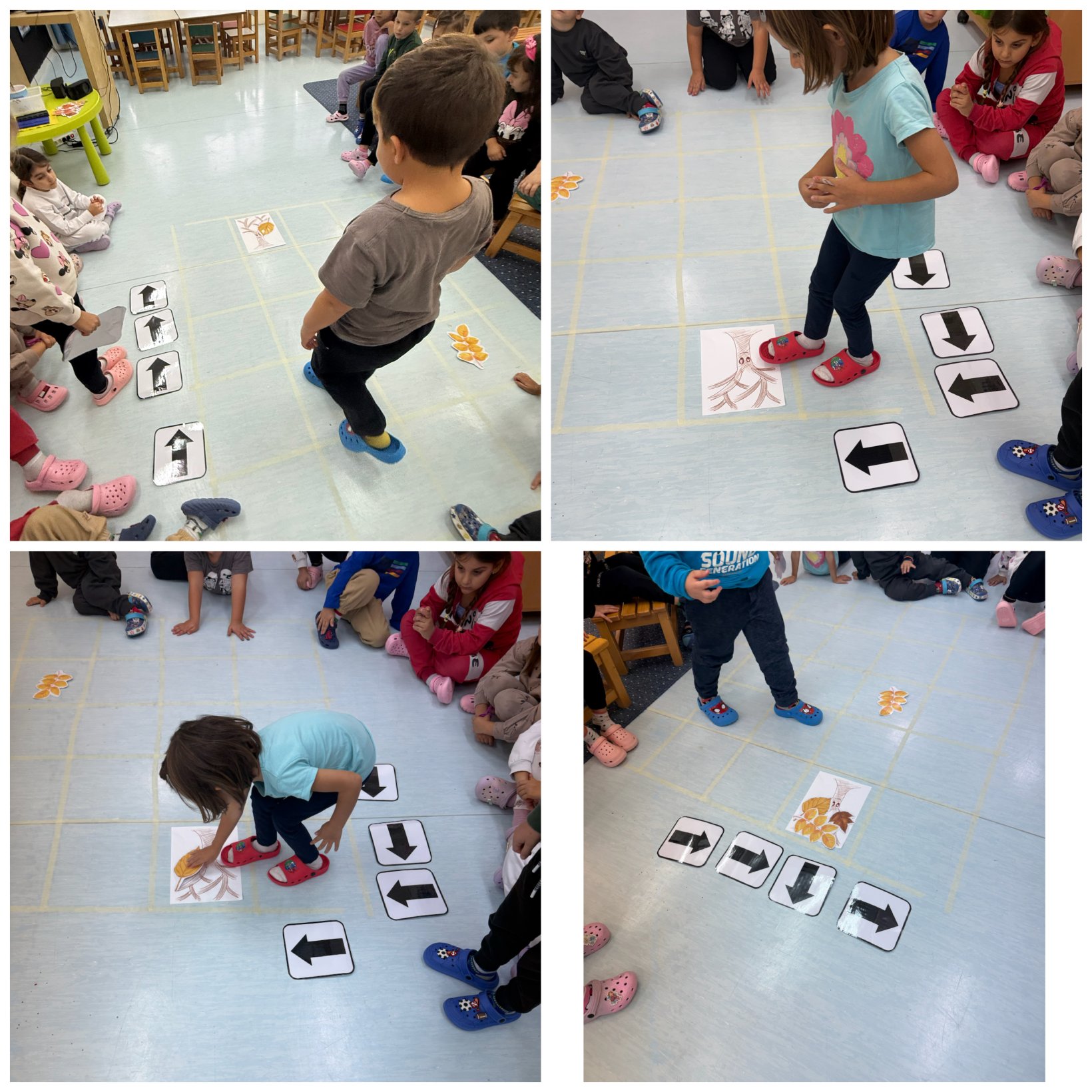 Στο «Direction Coding Game» οι μαθητές εργάστηκαν με κατευθύνσεις (μπροστά, πίσω, αριστερά, δεξιά) μέσα από κινητικές και επιτραπέζιες δραστηριότητες. Τα παιδιά κλήθηκαν να «προγραμματίσουν» διαδρομές για έναν χαρακτήρα, ενισχύοντας την κατανόηση της χωρικής οργάνωσης και της έννοιας της ακολουθίας. Η δραστηριότητα συνέβαλε στην ανάπτυξη δεξιοτήτων προσανατολισμού και λογικής σκέψης.