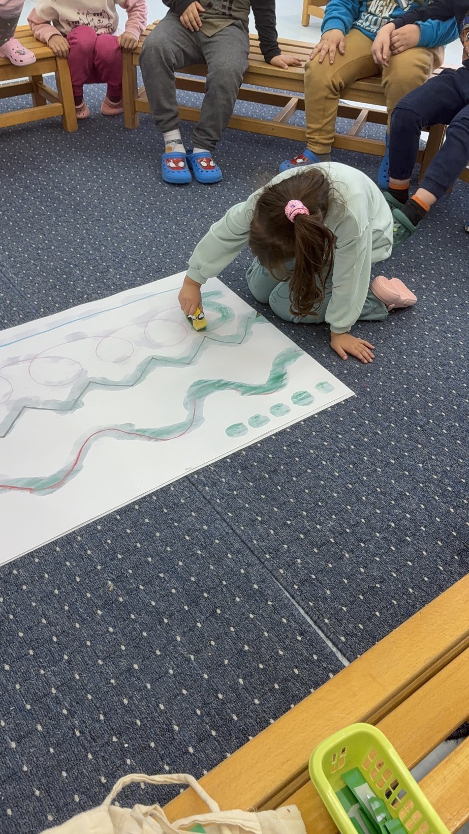 Η εκμάθηση του τραγουδιού συνοδεύτηκε και από εικαστική δραστηριότητα: κάθε ομάδα απέδωσε τους στίχους ζωγραφικά, μετατρέποντας τις λέξεις σε εικόνες. Η διαδικασία ενίσχυσε τη σύνδεση λόγου – εικόνας – μουσικής και επέτρεψε στα παιδιά να εκφράσουν δημιουργικά το μήνυμα του τραγουδιού.