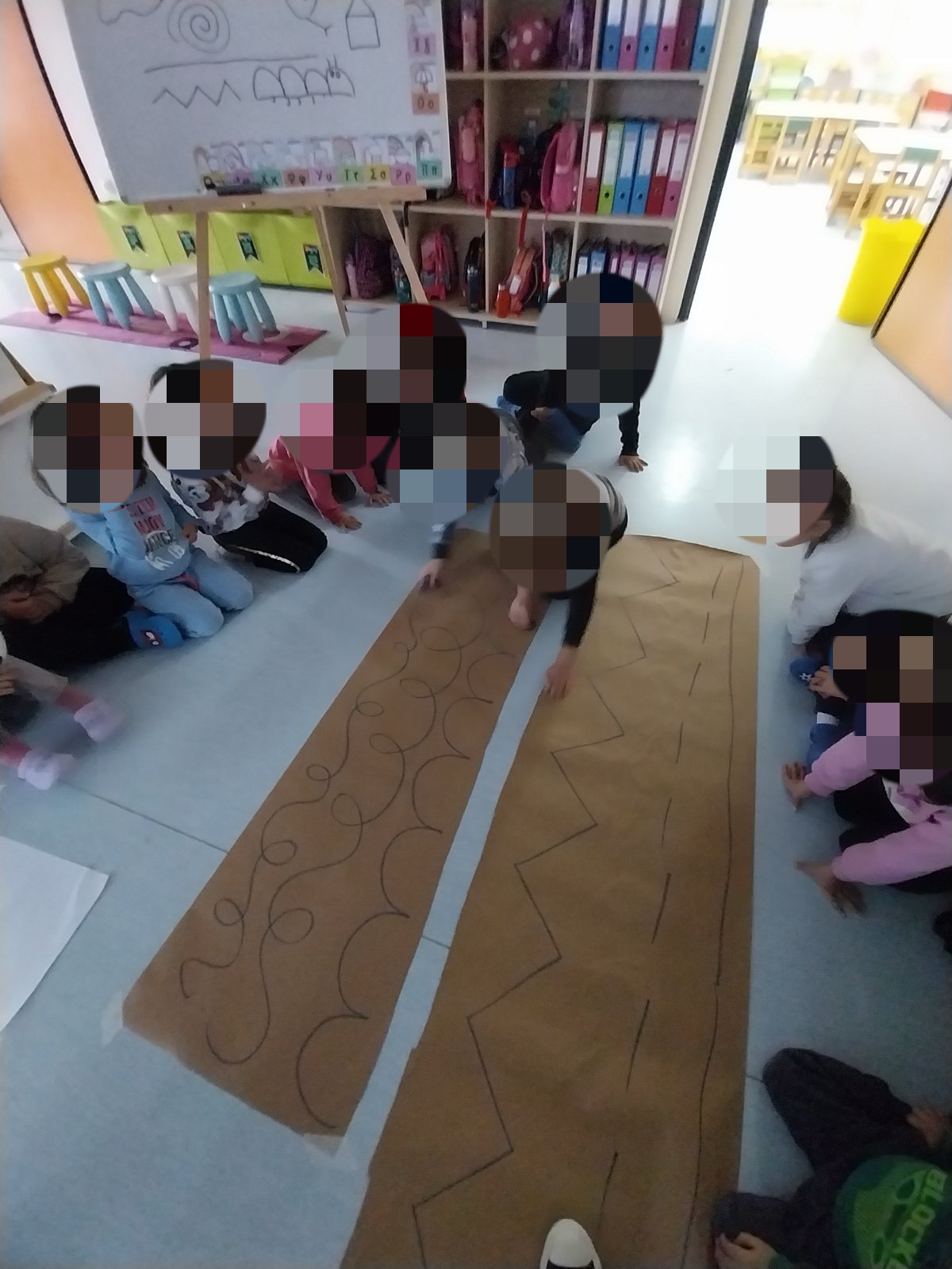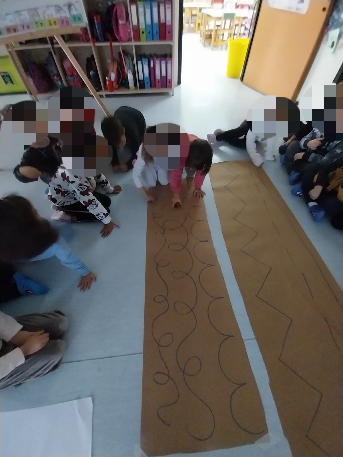 Πρόκειται για μια ομαδική δραστηριότητα όπου τα παιδιά ακολουθούν διαδοχικά μια σειρά μεγάλων γραμμών πάνω σε χαρτί με στόχο να οδηγήσουν το σαλιγκάρι στο σπίτι του. Περνώντας από την κάθε γραμμή αφήνει τα ίχνη του! Κάθε διαδρομή γίνεται αφορμή για περιγραφή, ονοματοδοσία και μαθηματική παρατήρηση (π.χ. “πόσες στροφές έχει;”, “πού αλλάζει κατεύθυνση;”). Η δραστηριότητα συνδέεται με τους στόχους του ΑΠΣ στους τομείς της γλώσσας, κινητικότητας και μαθηματικών.