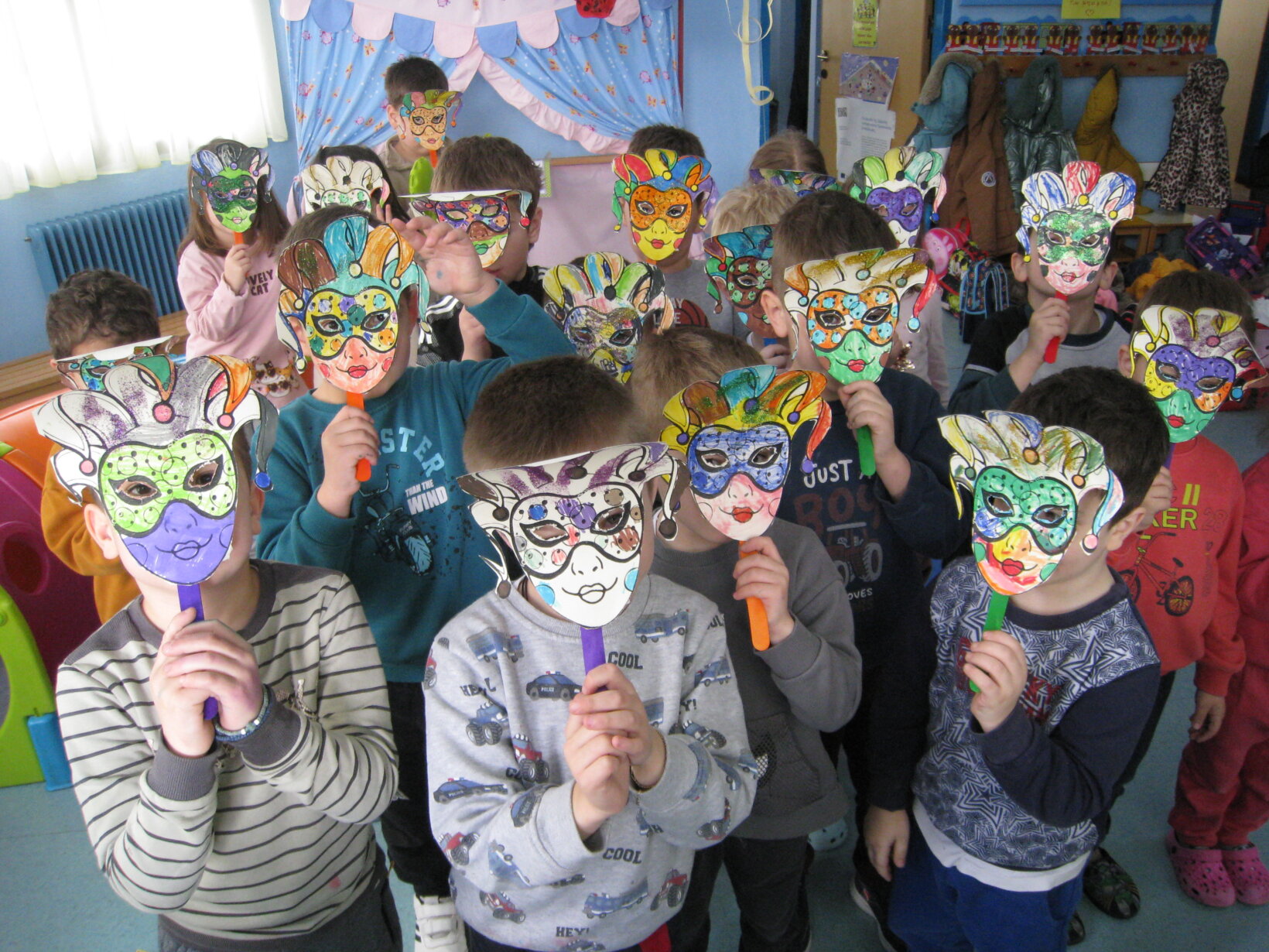 Το Αποκριάτικο ταξίδι μας ξεκίνησε. Γνωρίσαμε τα αποκριάτικα ήθη και έθιμα άλλων περιοχών με έμφαση στα πανάρχαια έθιμα του Σοχού , τους γνωστούς κουδουνοφόρους που σήμερα μάλιστα πέρασαν και έξω από το παράθυρο του σχολείου μας και θαυμάσαμε την εντυπωσιακή στολή τους…Σήμερα είχαμε μια διαφορετική γευστική εμπειρία, μιλήσαμε όμως και για την κυρία Σαρακοστή όπου την κατασκευάσαμε με αλατοζύμη…Ταξιδέψαμε στη Βενετία και φτιάξαμε τις Βενετσιάνικες μάσκες μας, βαφτήκαμε και γίναμε Ινδιάνοι και φυσικά ανήμερα Τσικνοπέμπτης γίναμε ζωγράφοι με τις παλέτες και τις μάσκες μας και ακολουθώντας την τεχνοτροπία του Κάλντερ φτιάξαμε τις αυτοσχέδιες στολές μας…