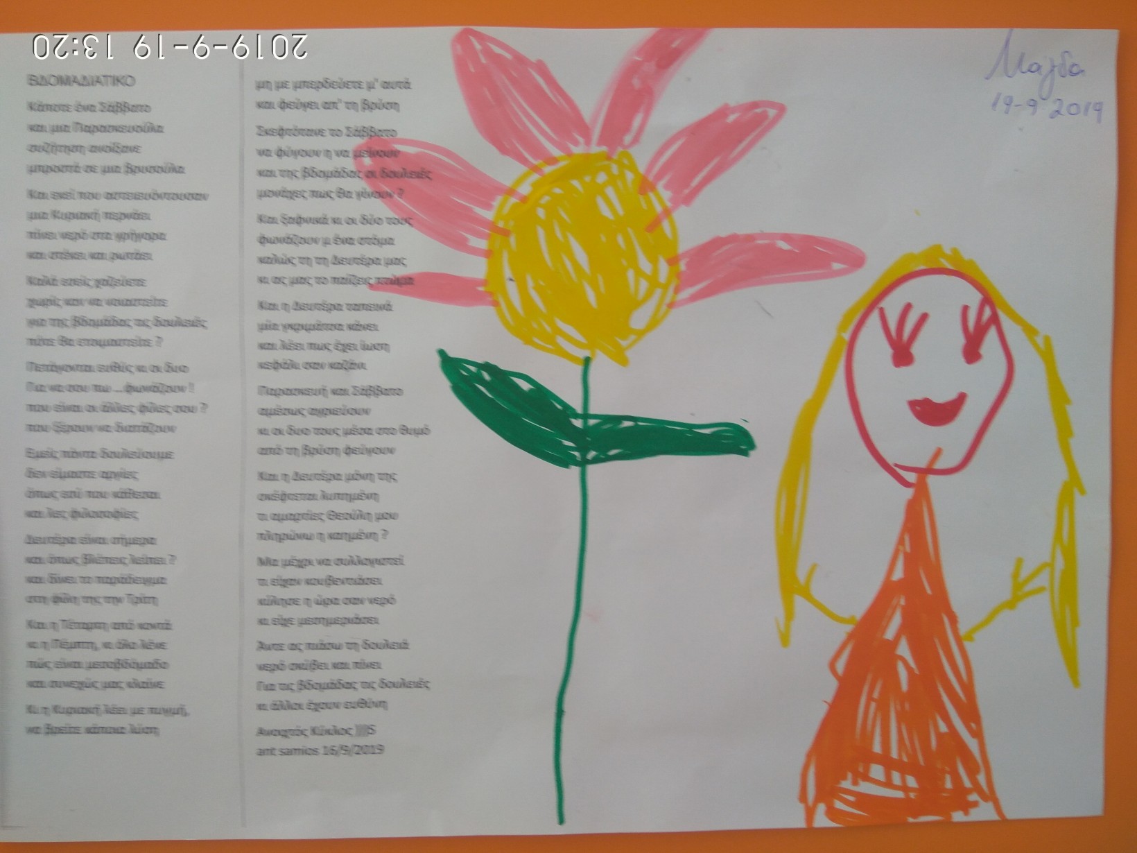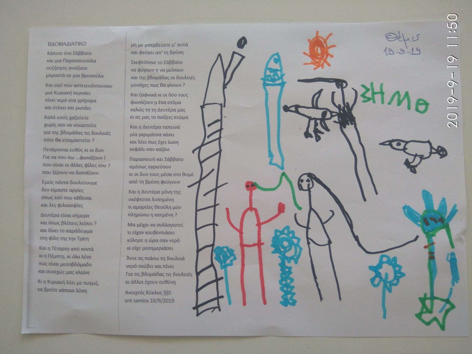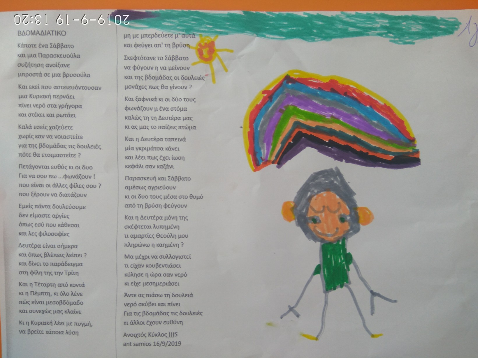 Με αφορμή ένα διαφορετικό ποίημα με πολύ χιούμορ, ενός φίλου και συμμαθητή ,το “ΒΔΟΜΑΔΙΑΤΙΚΟ” σήμερα 19 Σεπτεμβρίου 2019 τα παιδιά με το δικό τους δημιουργικό τρόπο αποτύπωσαν τις μέρες της βδομάδας .