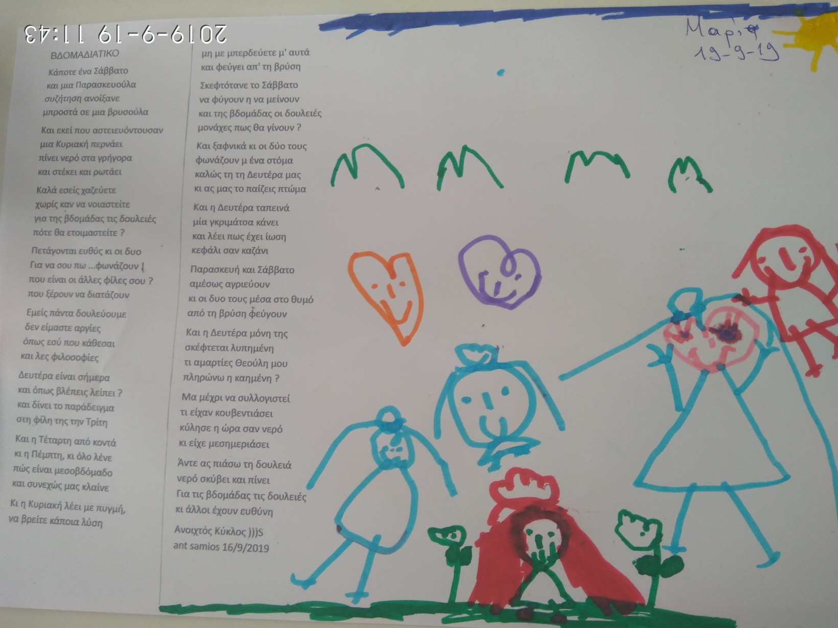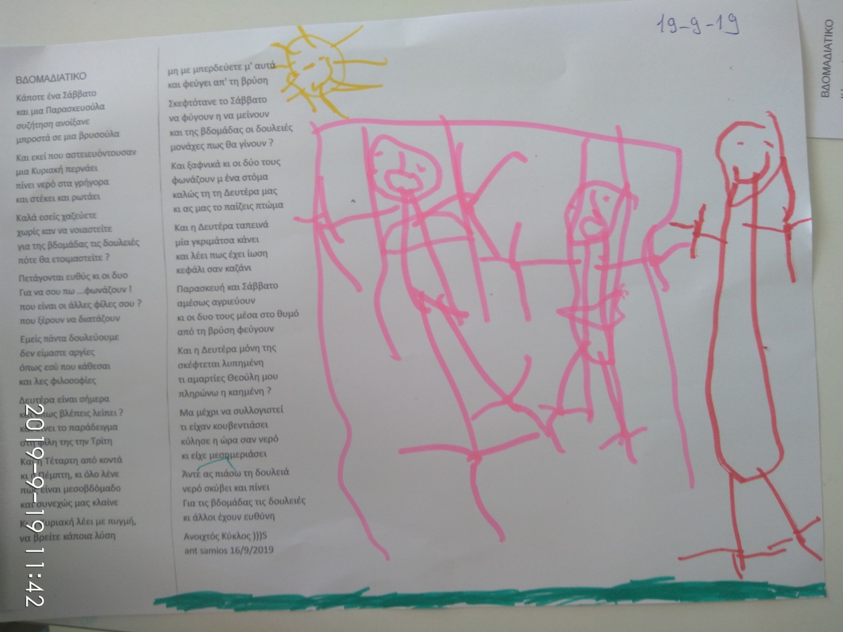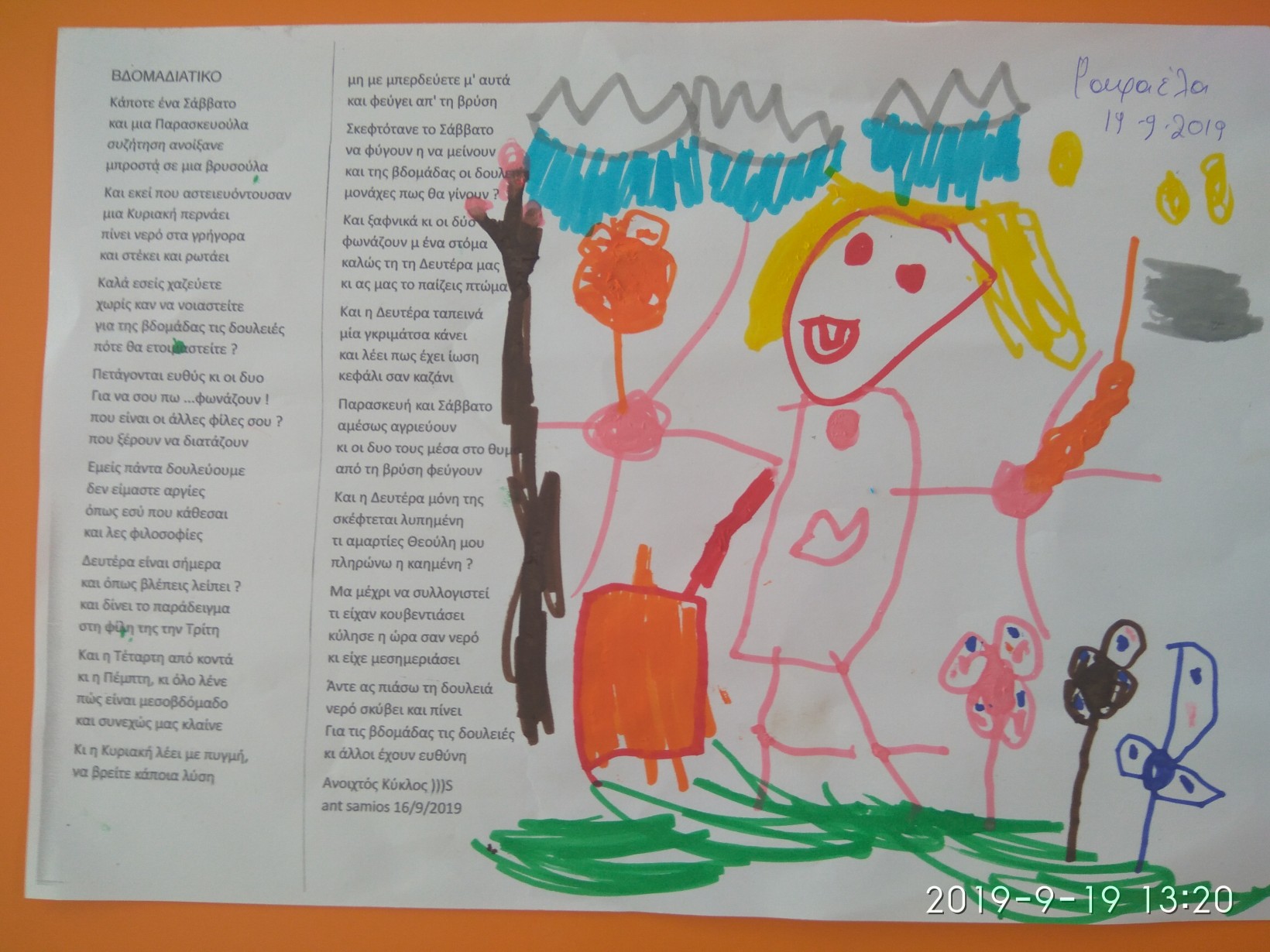 Με αφορμή ένα διαφορετικό ποίημα με πολύ χιούμορ, ενός φίλου και συμμαθητή ,το “ΒΔΟΜΑΔΙΑΤΙΚΟ” σήμερα 19 Σεπτεμβρίου 2019 τα παιδιά με το δικό τους δημιουργικό τρόπο αποτύπωσαν τις μέρες της βδομάδας .