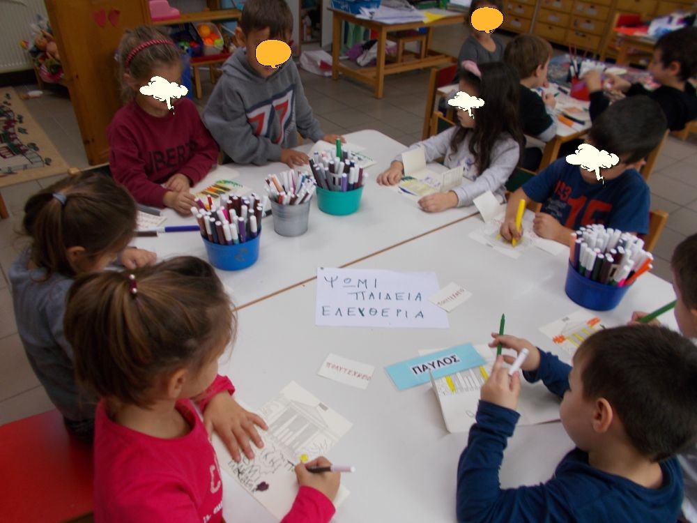 -Δραματοποιήσαμε την ιστορία της “Κυρα Δημοκρατίας”, πήγαμε έξω από το σπίτι της Ρίας της Δικτατορίας, την διώξαμε από το χωριό και ελευθερώσαμε από το υπόγειό της την Δημοκρατία, που είχε φυλακισμένη. Γιορτάσαμε την επαναφορά της στην πλατεία του χωριού φωνάζοντας το σύνθημά της :“ΟΛΟΙ ΜΑΖΙ, ΟΛΟΙ ΜΑΖΙ ΕΙΜΑΣΤΕ ΠΑΝΤΑ ΠΙΟ ΔΥΝΑΤΟΙ”: