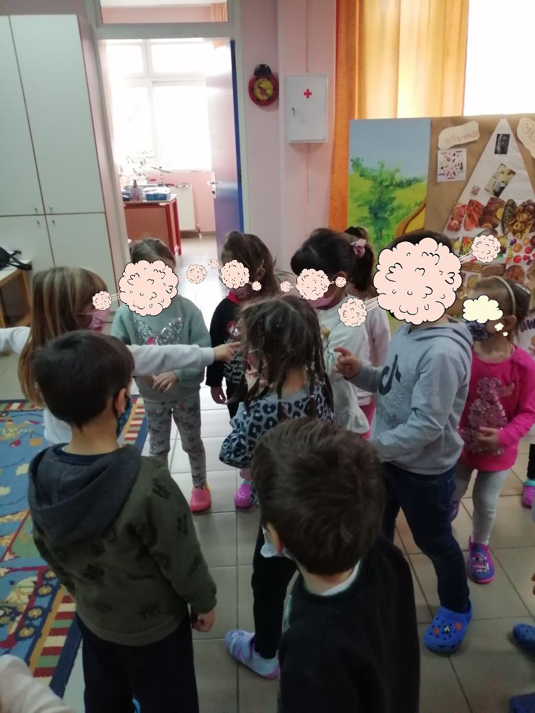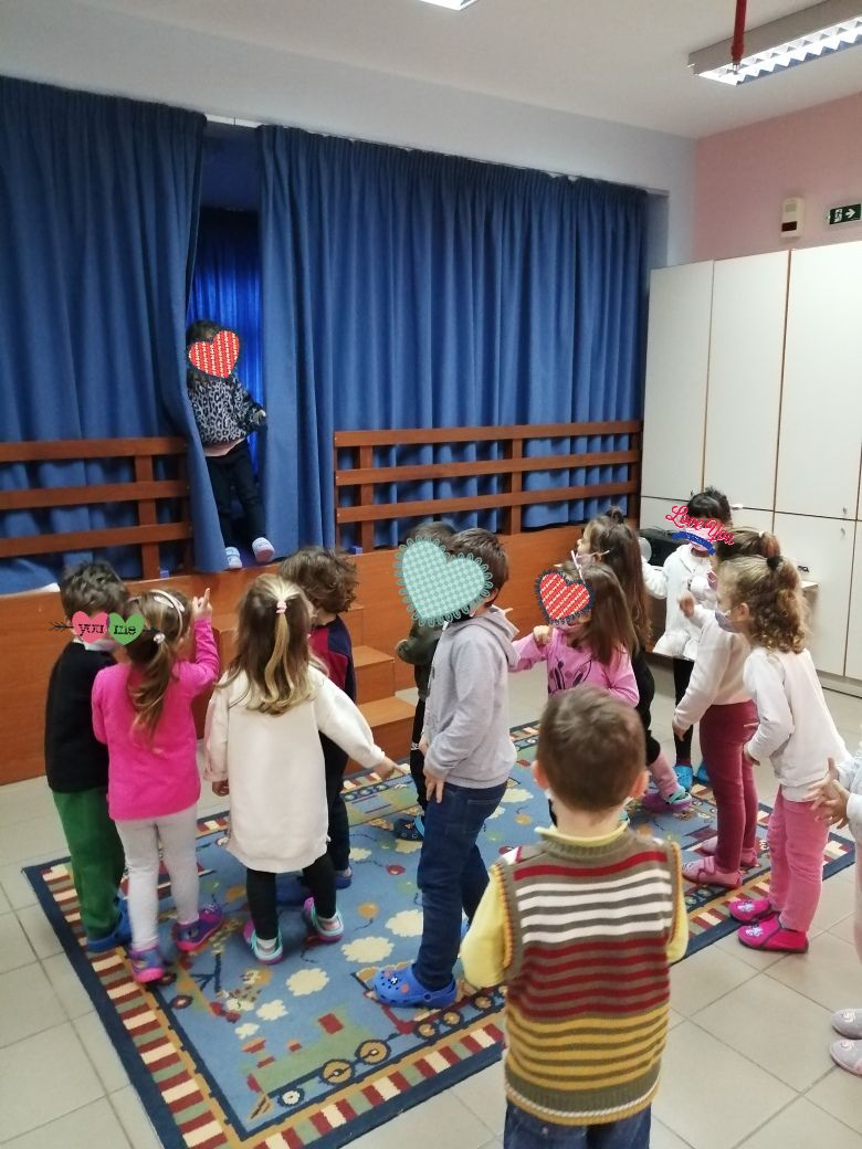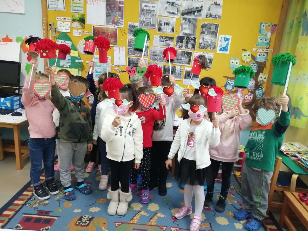 -Εμπνευστήκαμε από το τραγούδι “Τα παιδιά ζωγραφίζουν στον τοίχο” και …κάναμε το ίδιο!! Ζωγραφίσαμε το τραγούδι και κόψαμε κόκκινα χαρτονάκια σαν ψηφίδες (για τις καρδιές), σχίσαμε κίτρινο γκοφρέ χαρτί (για τον ήλιο) και τα κολλήσαμε σε μια πανέμορφη ομαδική εργασία που στόλισε το Νηπιαγωγείο μας (2021-22):