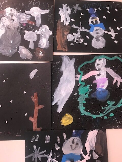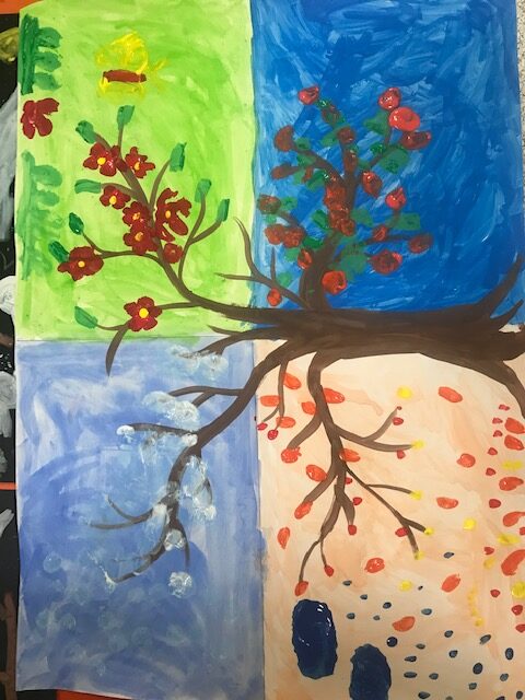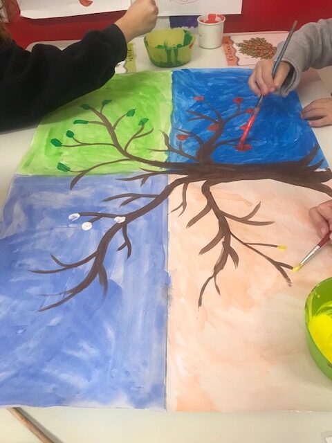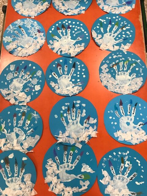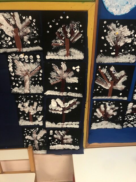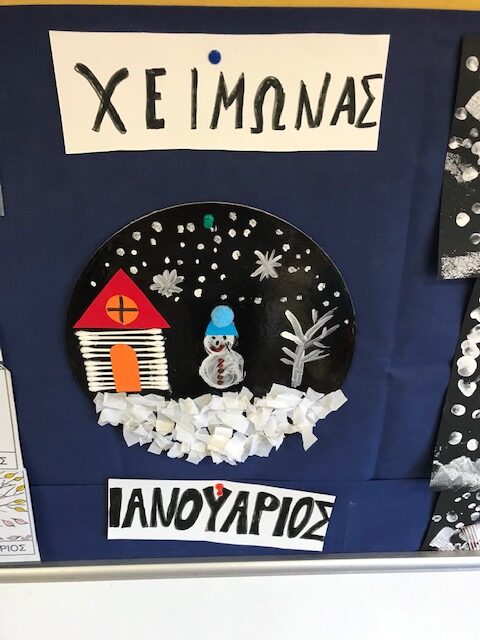Φτιάχνουμε και το δέντρο των 4 εποχών δουλεύντας σε ομάδες και βάζοντας όλη μας την φαντασία .Χιονανθρωπάκια με τις παλάμες μας και με πολύχρωμα σκουφάκια.Παίζουμε το παιχνίδι “Η μύτη του χιονάνθρωπου”‘ ,όπου κάθε παιδί βάζει στον χιονάνθρωπο για μύτη τόσα κομμάτια καρότου ,όσα λέει ο αριθμός από το ζάρι μου πετάει!