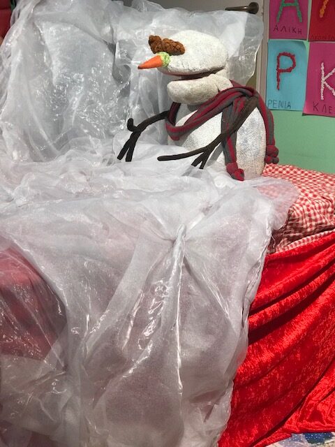 Παρακολουθήσαμε την παράσταση κουκλοθεάτρου”Ο χιονάνθρωπος που δεν ήθελε να λιώσει’,όπου τα παιδιά συμμετείχαν βιωματικά στην παράσταση ,γνώρισαν την κατασκευή της κούκλας και φόρεσαν πολλά αξεσουάρ ,καπέλα και μάσκες.