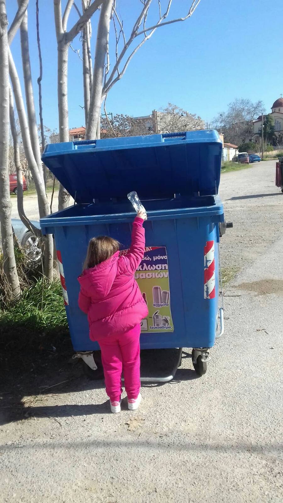 Υιοθετούμε στάσεις και συμπεριφορές φιλικές προς το περιβάλλον από μικρή ηλικία . Τοποθετούμε στον Μπλε κάδο , που βρίσκεται μπροστά στην είσοδο του Νηπιαγωγείου ,τα πλαστικά μπουκάλια που δεν τα χρειαζόμαστε πλέον.