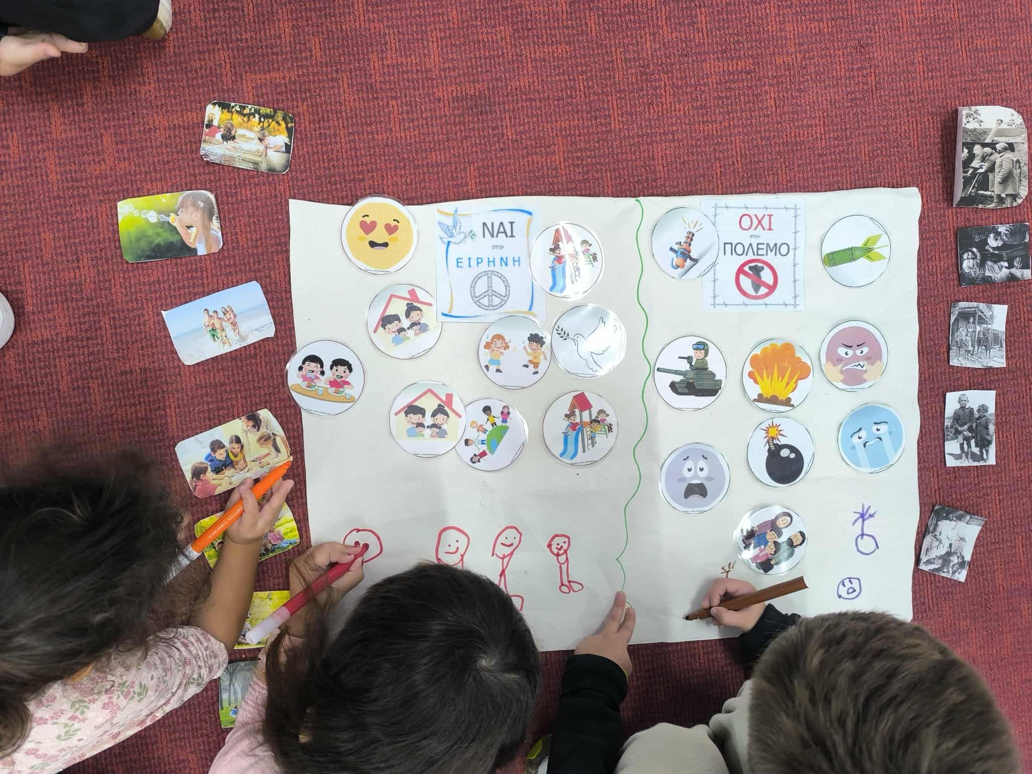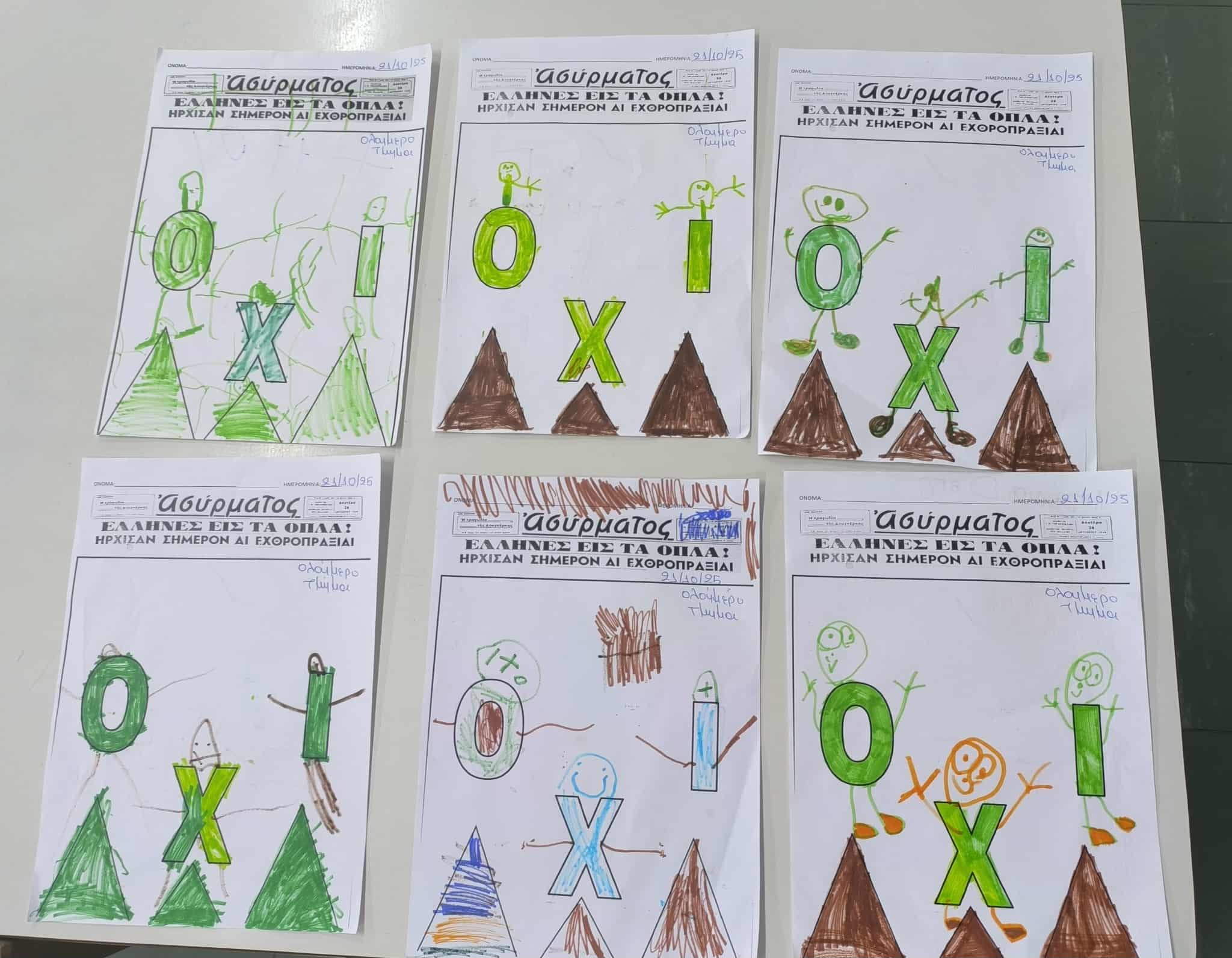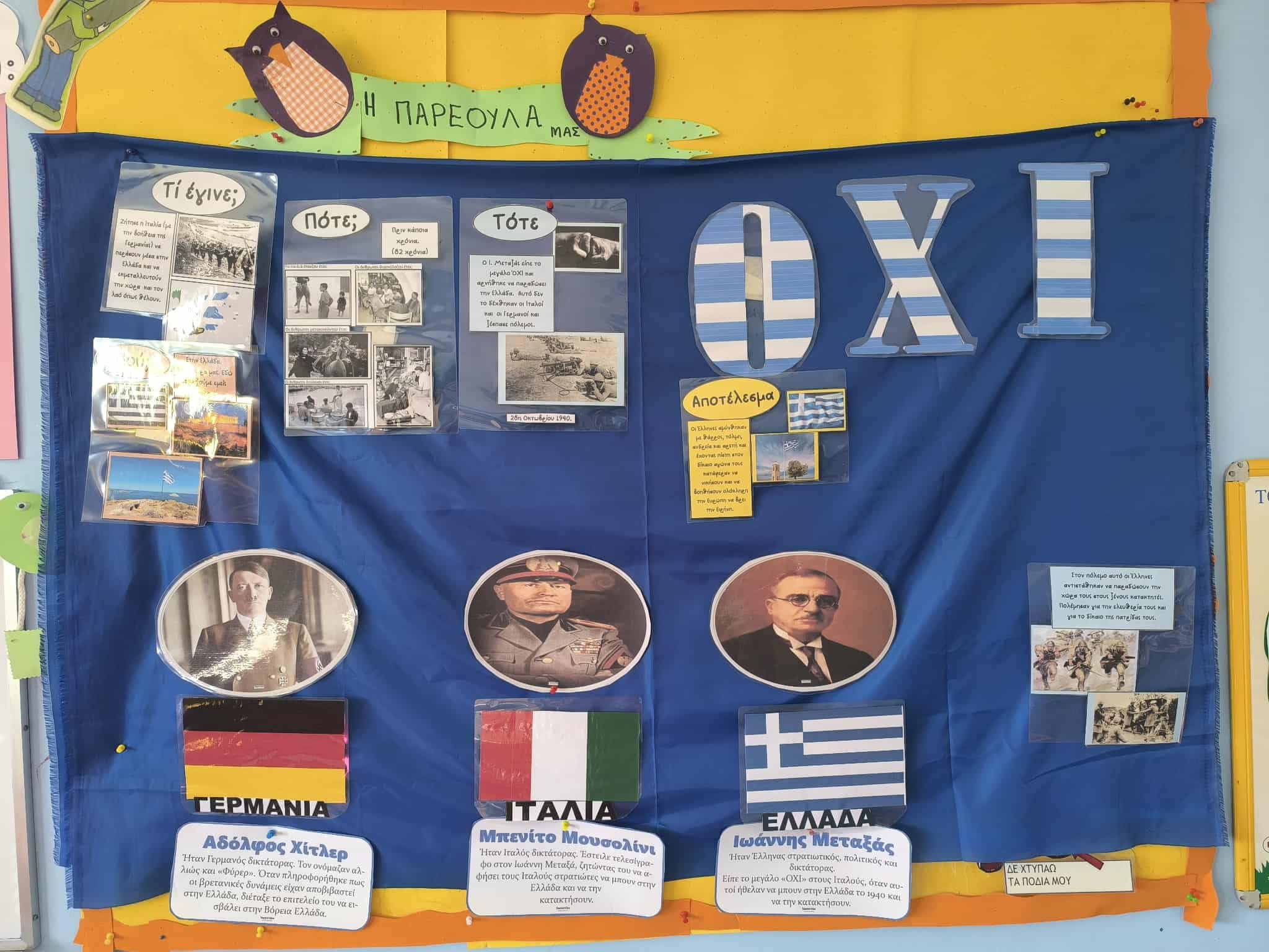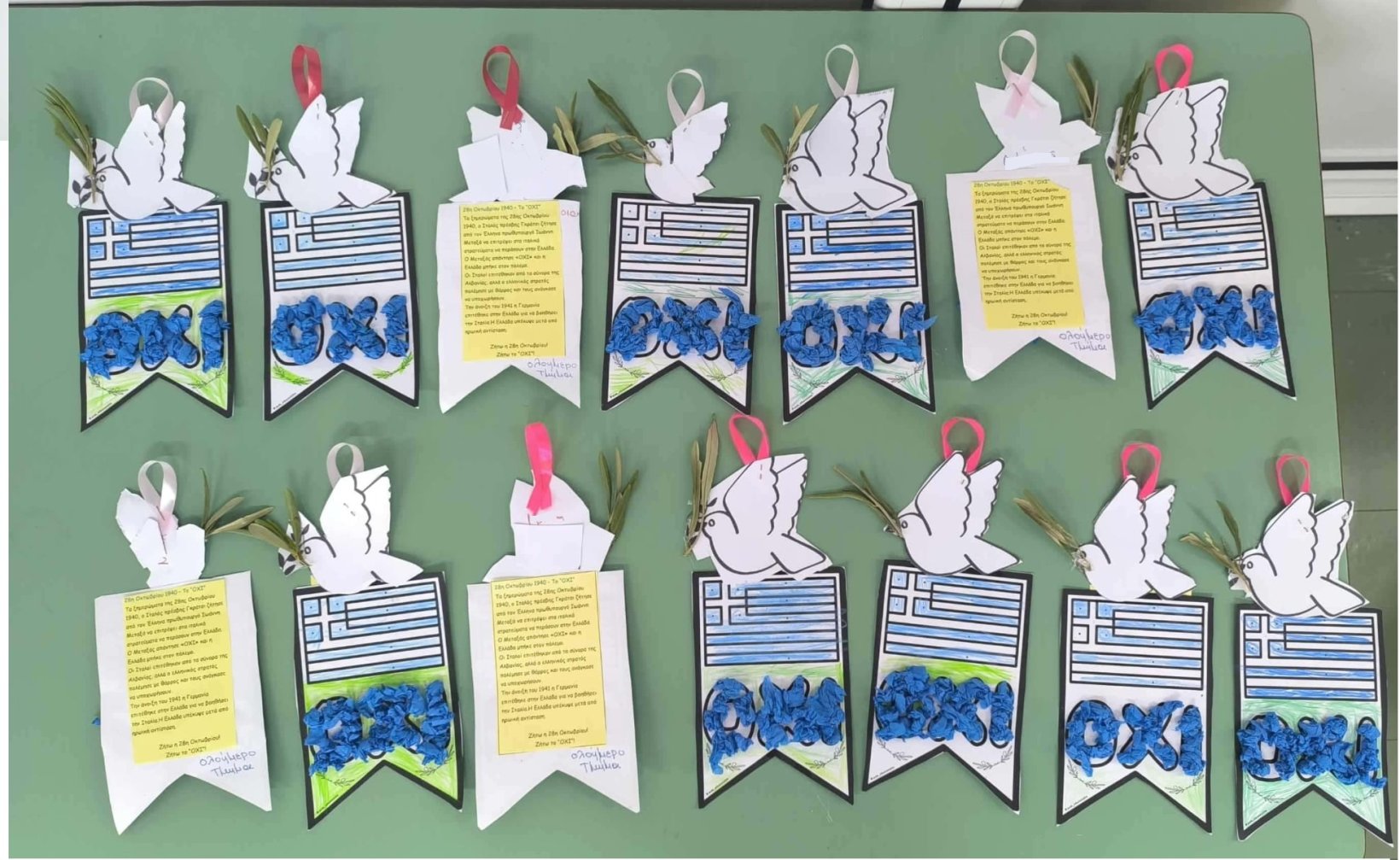 Στο ολοήμερο τμήμα, προσεγγίσαμε την έννοια του “Όχι”, του “Πολέμου-Ειρήνης”. Ακούσαμε όλοι μαζί το έκτακτο ανακοινωθέν του πολέμου όπως ακούστηκε τότε από το ραδιόφωνο. Όλες οι δράσεις έγιναν μέσα από δραστηριότητες που ενισχύουν τη συνεργασία, τη δημιουργικότητα και τη συλλογική προσπάθεια. Μάθαμε πως η αγάπη, η φιλία και ο σεβασμός είναι τα «όπλα» του σήμερα.
