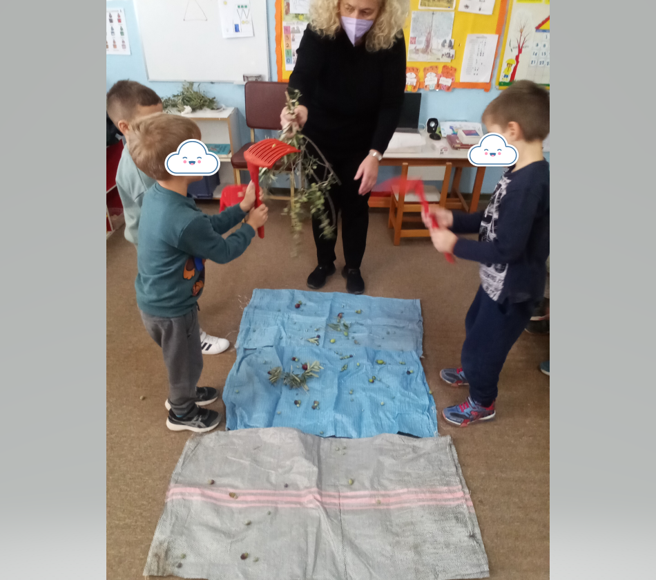 Η ενότητα συνεχίστηκε με έναν περίπατο γύρω από το σχολείο μας, όπου οι μικροί μας μαθητές παρατήρησαν τα ελαιόδεντρα ,μάζεψαν τις ελίτσες αφού πρώτα ράβδισαν την Ελιά χρησιμοποιώντας τα απαραίτητα εργαλεία.. ” τα χτενάκια”…