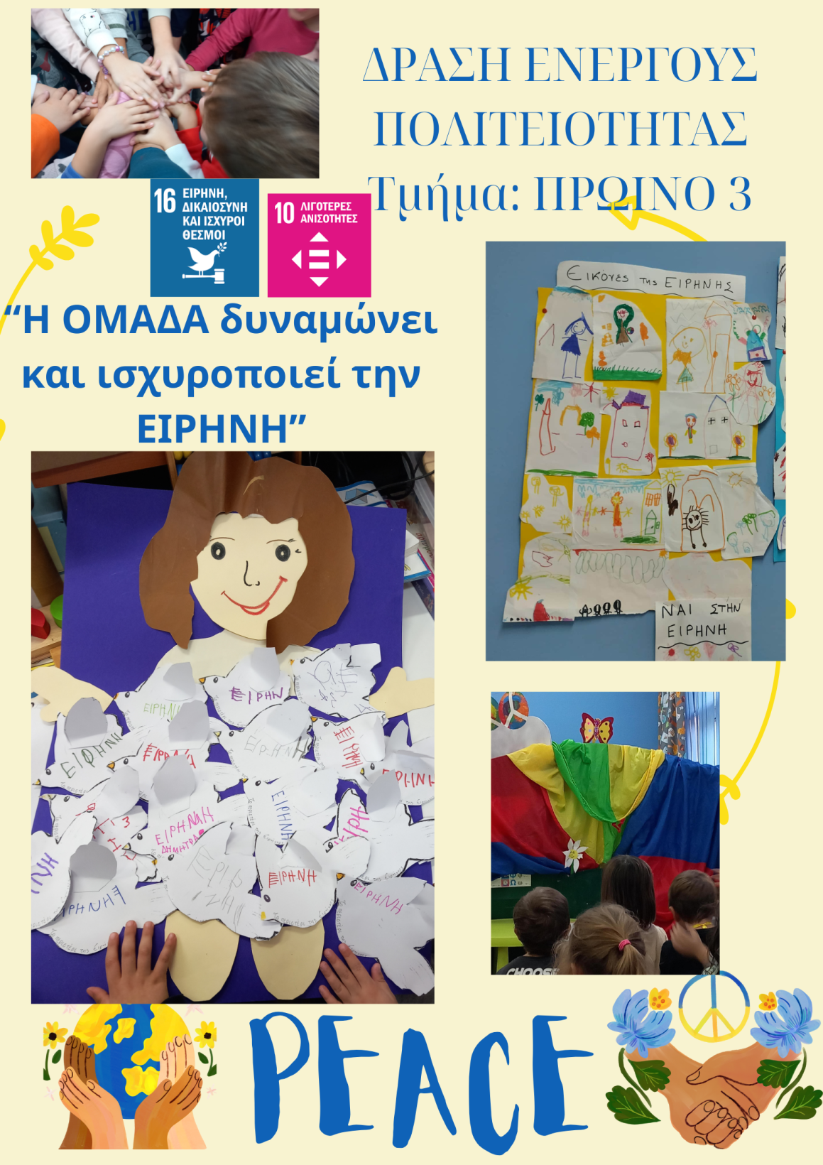 Στο πλαίσιο ενίσχυσης της Ενεργούς Πολιτειότητας οι μαθητές/τριες του 3ου Πρωινού τμήματος έδωσαν έμφαση στην έννοια της ΕΙΡΗΝΗΣ και τη σημασία που έχει η συλλογικότητα της ομάδας στην ισχυροποίησή της.