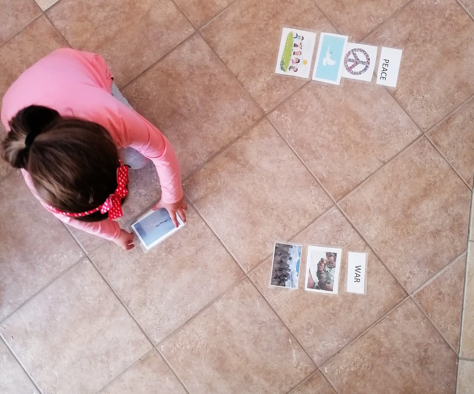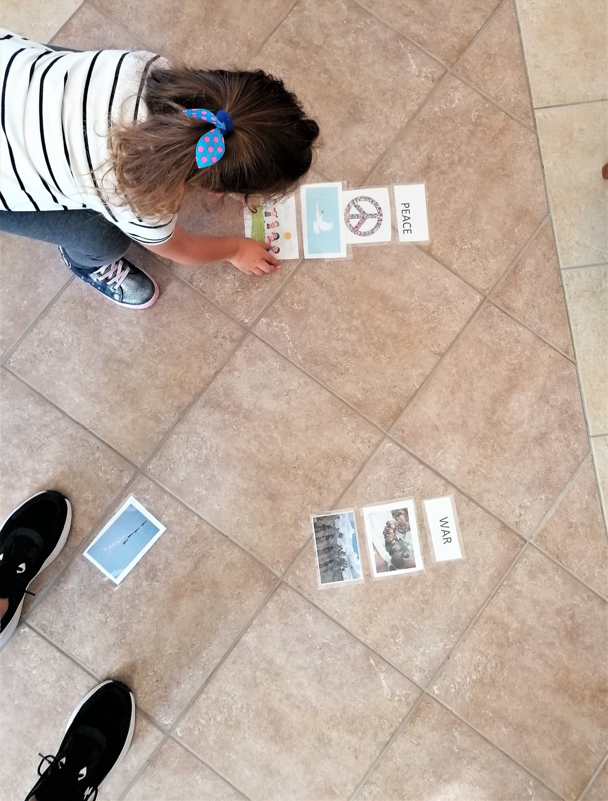Στο πλαίσιο των μαθημάτων του πολέμου και της ειρήνης, στο μάθημα των αγγλικών τα παιδιά εξοικειώθηκαν με τις έννοιες war and peace ,μέσω ενός παιχνιδιού στο οποίο θα έπρεπε να ταιριάξουν τις εικόνες του πολέμου με το WAR και τις εικόνες της ειρήνης με το peace. Συζητήσαμε για τα θετικά και τα αρνητικά συναισθήματα. Πως νιώθουμε στον πόλεμο και πως όταν έχουμε ειρήνη. (happy, sad, scared, angry).