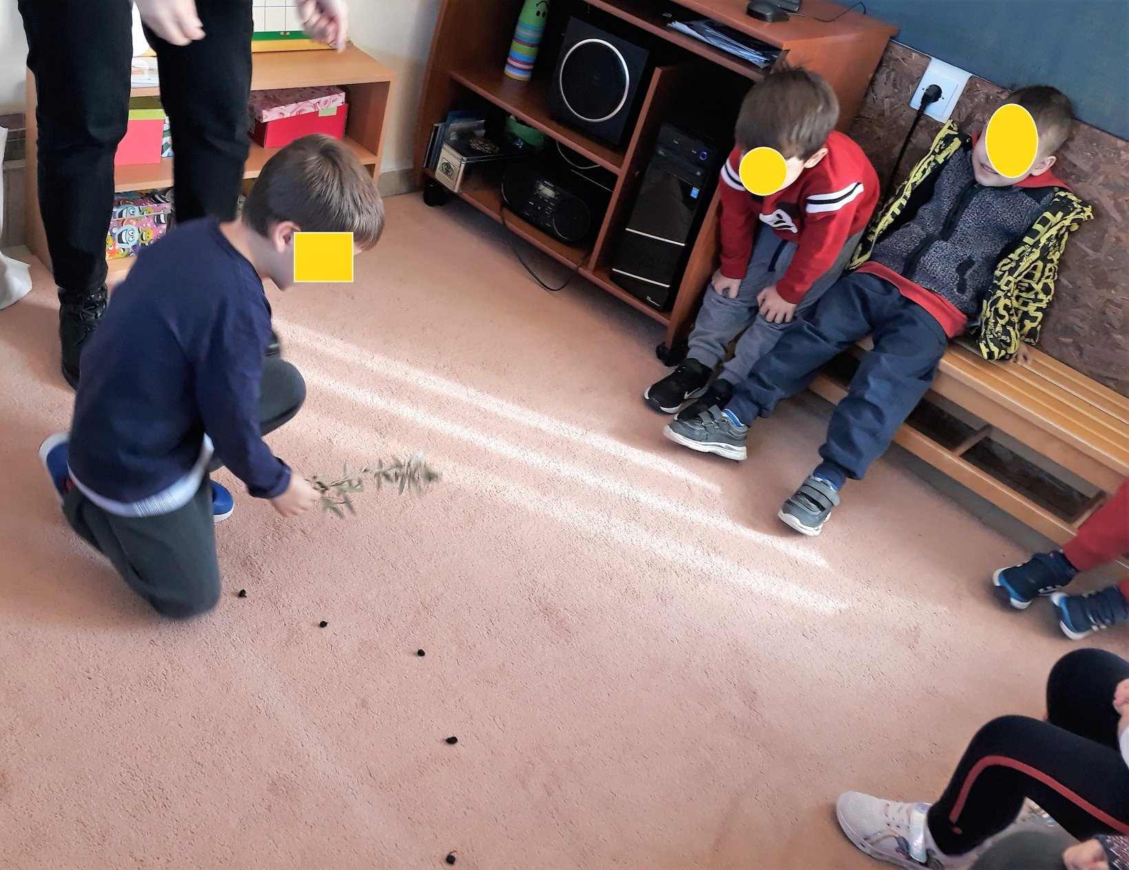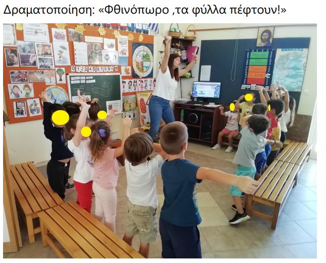 Μιλήσαμε για το δέντρο της ελιάς ( olive tree), είδαμε τα κλαδιά και τα φύλλα της ελιάς ( branches-olive leaves). Μάθαμε πώς λένε τις ελιές (olives). Και ως δραστηριότητα ζωγράφισαμε και μετρήσαμε πόσες ελιές είναι πάνω στο δέντρο και πόσες είναι κάτω από το δέντρο και κάναμε επανάληψη στα χρώματα black και green. Τέλος, παίξαμε: μάζεψε τις ελιές/pick up the olives. Κάθε παιδί, τινάζει ένα κλαδί ελιάς και μαζεύει τις ελιές από χαρτόνι που πέφτουν στο έδαφος.