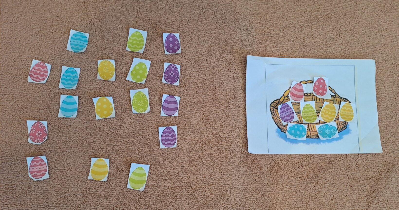 Τα παιδιά μαθαίνουν λέξεις που σχετίζονται με την γιορτή του Πάσχα, παίζοντας το παιχνίδι ” Put the Easter eggs into the basket”. Τα παιδιά μέσα από αυτή τη διαδικασία, μαθαίνουν να μετρούν τα αυγά και να βρίσκουν το σωστό χρώμα.