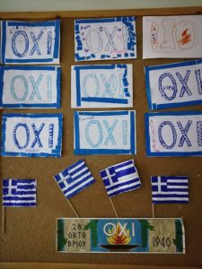 Διαβάσαμε το βιβλίο του Μανδηλαρά, μάθαμε , είδαμε , παίξαμε ρόλους , ζωγραφίσαμε , εκφράστηκαν ιδέες , μια απο αυτές έγιναν βιβλίο με τίτλο ο πόλεμος, γράψαμε τις λέξεις που έμειναν στην ιστορία, μελετήσαμε τον πίνακα του Εκτωρ Δούκα, Η εποποιϊα της Πίνδου, οπου ειδαμε την συμβολή των γυναικών της Πίνδου στον πόλεμο του 1940, κάναμε κατασκευές, κεντήσαμε την ελληνική σημαία ( το ολοήμερο τμήμα) και νοιώσαμε ότι κάθε χρόνο τιμούμε την εθνική επέτειο με γιορτές , παρελάσεις , κατάθεση στεφάνων.