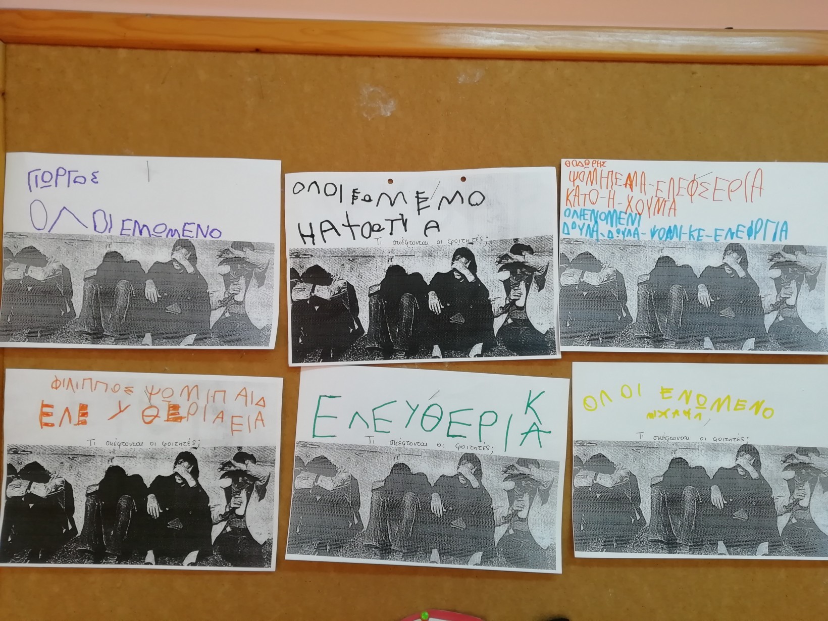 Διαβάσαμε το βιβλίο του Φ. Μανδηλαρά , Η εξέγερση του Πολυτεχείου, είδαμε εικόνες εποχής, βίντεο, συζητήσαμε , μάθαμε , περιγράψαμε τα συναισθήματά μας για την χούντα και την δημοκρατία, παίξαμε ρόλους απο το βιβλίο, καταλάβαμε το Πολυτεχνείο, τραγουδήσαμε, δημιουργήσαμε αφίσα, γράψαμε συνθήματα, ζωγραφίσαμε το Πολυτεχνείο ατομικά
