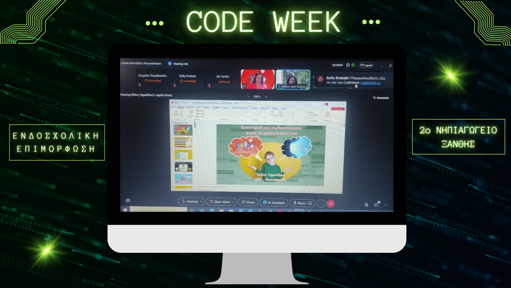 Το εκπαιδευτικό προσωπικό του σχολείου μας συμμετείχε με ενθουσιασμό σε δύο σημαντικές διαδικτυακές επιμορφωτικές συναντήσεις στο πλαίσιο της Ενδοσχολικής Επιμόρφωσης 2025-2026 και με αφορμή τη συμμετοχή μας στην Ευρωπαϊκή Εβδομάδα Κώδικα. Οι επιμορφώσεις, με κύριο άξονα τον Προγραμματισμό (Coding) και τη διεθνή δράση Code Week 2025, διοργανώθηκαν από το Νηπιαγωγείο Ριζαριού σε συνεργασία με τον νέο Εθνικό Κόμβο City Lab.