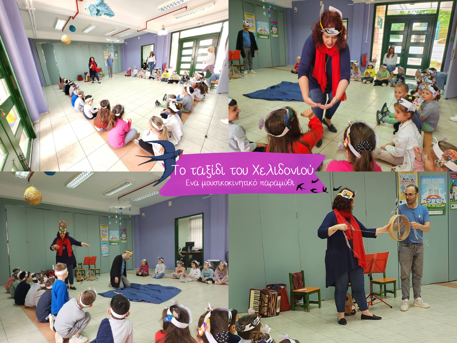 Σήμερα τα παιδιά παρακολούθησαν τη διαδραστική αφήγηση του μουσικοκινητικού παραμυθιού “Το ταξίδι του χελιδονιού”, από την καλλιτεχνική ομάδα “Μελωδικές Εξερευνήσεις”, με συνοδεία ακορντεόν, φλογέρας, γιουκαλίλι και μεταλόφωνου.