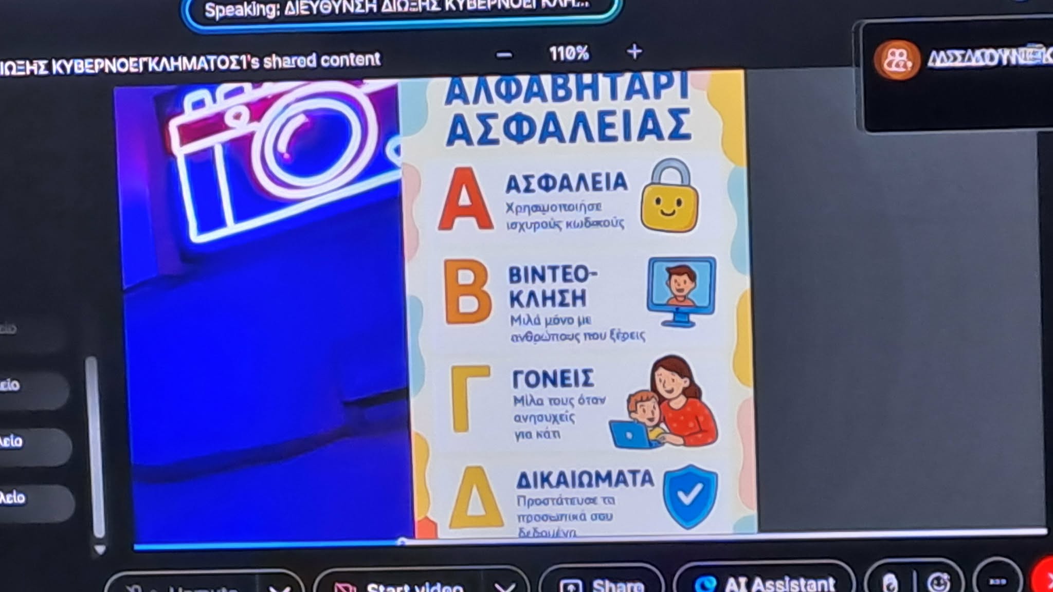 Σήμερα, Παρασκευή 6 Φεβρουαρίου 2026, οι μαθητές και οι μαθήτριες των τάξεων Ε΄ και ΣΤ΄ του σχολείου μας συμμετείχαν σε διαδικτυακή ενημερωτική εκδήλωση, στο πλαίσιο της Ημέρας Ασφαλούς Πλοήγησης στο Διαδίκτυο, η οποία εορτάζεται κάθε χρόνο τη δεύτερη Τρίτη του Φεβρουαρίου.