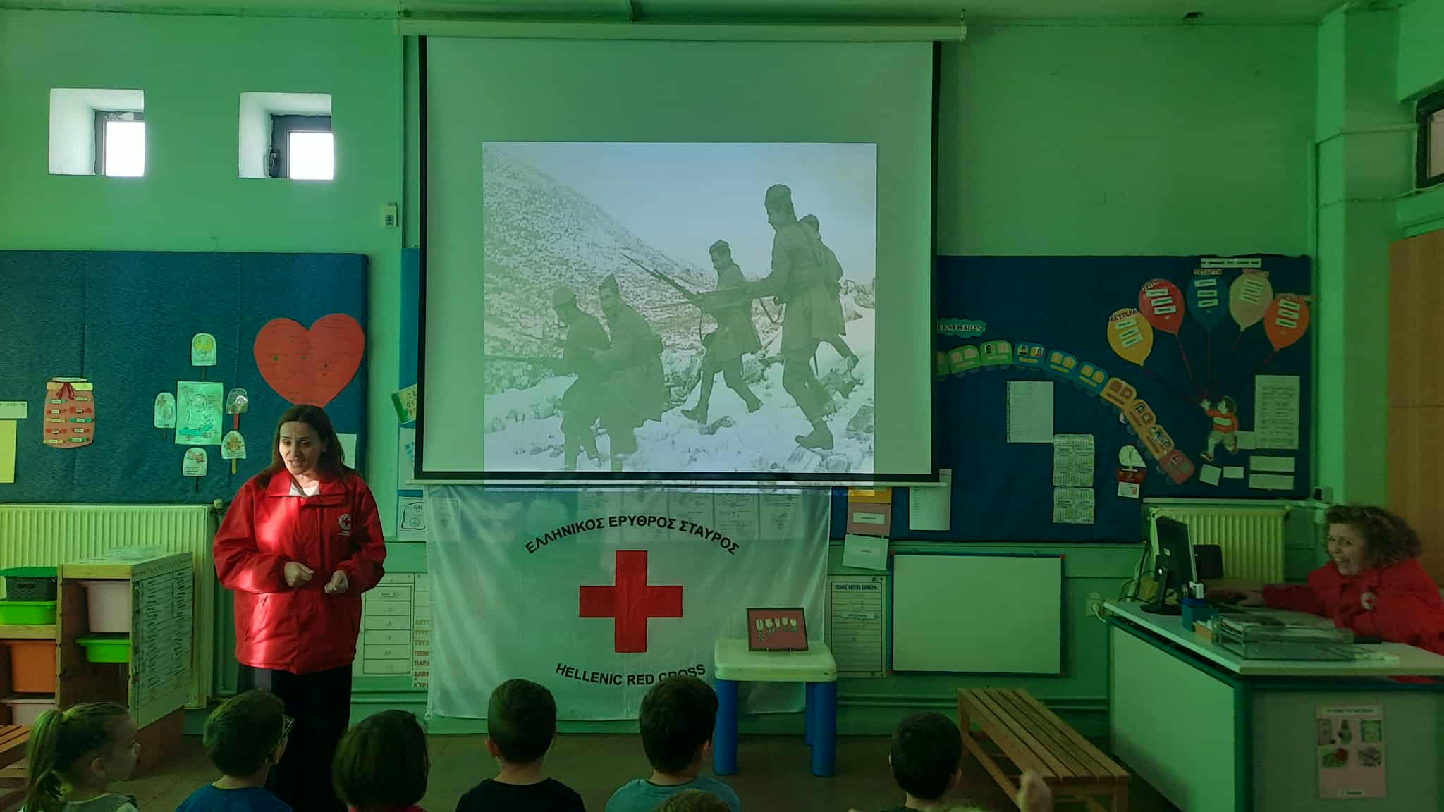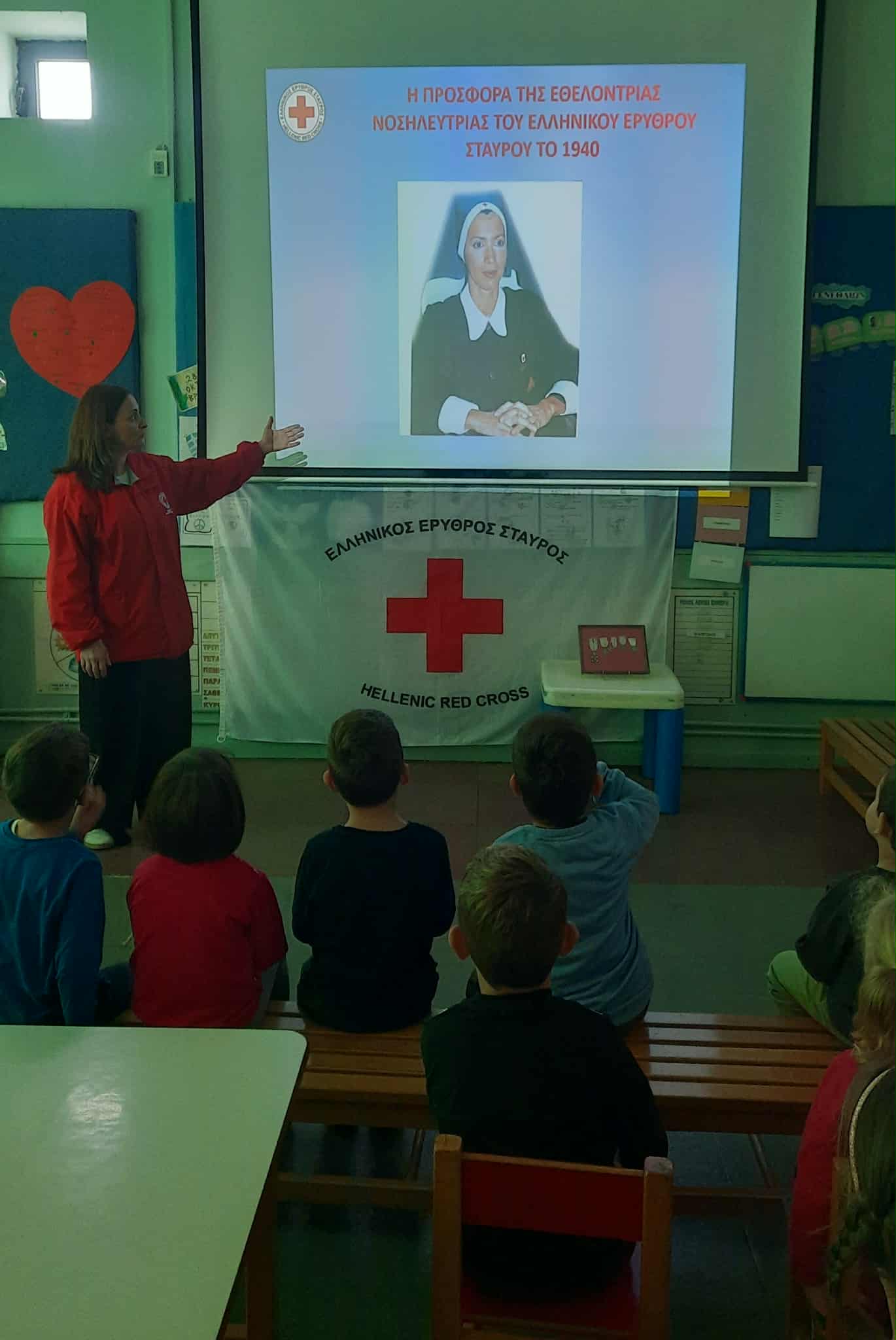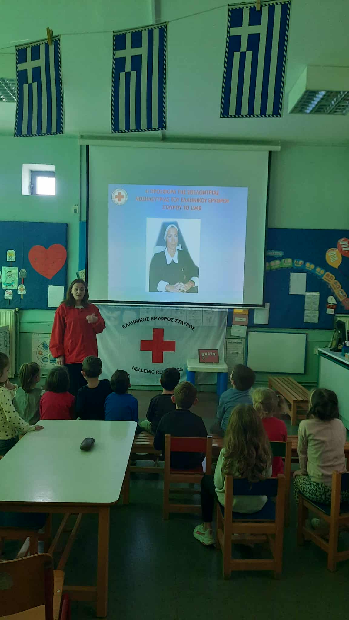 Ήρθαν στο χώρο του σχολείου μας οι εκπαιδεύτριες -νοσηλεύτριες του Ελληνικού Ερυθρού Σταυρού και έκαναν μια διάλεξη στα παιδιά για την προσφορά των εθελοντριών -νοσοκόμων την περίοδο του πολέμου του 1940. Αφού μίλησαν για την 28η Οκτωβρίου ,έδειξαν στα παιδιά ασπρόμαυρες φωτογραφίες από τον πόλεμο και τα παράσημα που δόθηκαν σε μια νοσηλεύτρια εθελόντρια που έκανε πολύ μεγάλο έργο την περίοδο του πολέμου . Τους έκανε εντύπωση το αυτοκίνητο με το σήμα του Ερυθρού Σταυρού και ήταν μια κοινωνική εμπειρία όμορφη για τα παιδιά .