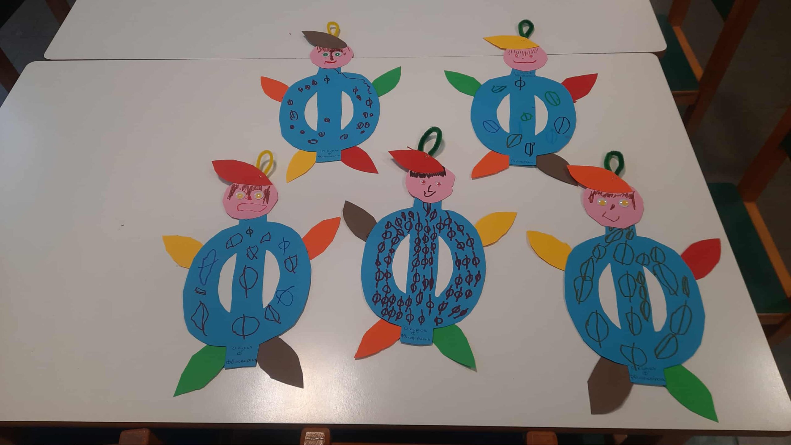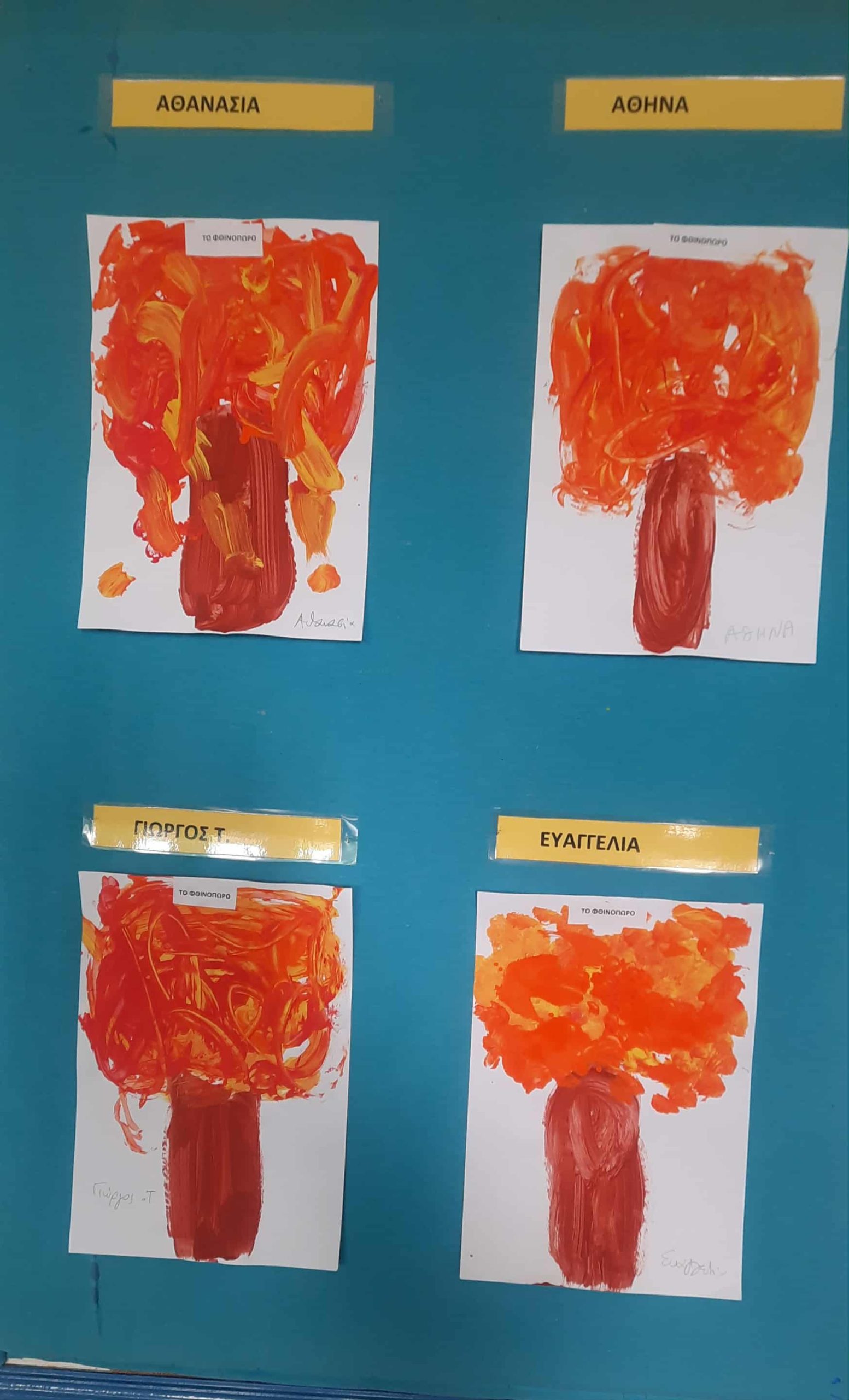 Μιλήσαμε για την εποχή του Φθινοπώρου ,για τις αλλαγές στις καιρικές συνθήκες ,για τα φθινοπωρινά φρούτα, για τα ρούχα που φοράμε .Τα παιδιά έφεραν στο σχολείο φθινοπωρινά φρούτα όπως (μήλα ,αχλάδια, ρόδια , κυδώνια κάστανα).Τα φτιάξαμε φρουτοσαλάτα και μιλήσαμε για τις βιταμίνες που έχουν . Μάθαμε αινίγματα για τα φρούτα και τα παιδιά ζωγράφισαν όποιο φρούτο τους αρέσει. Τα παιδιά ζωγράφισαν με τέμπερες το φθινόπωρο χρησιμοποιώντας τα χρώματα του φθινοπώρου (κόκκινο ,πορτοκαλί ,κίτρινο). Διαβάσαμε ιστορίες για το φθινόπωρο και φτιάξαμε σαλιγκάρια αφού έξω στην αυλή μας είδαμε κάποια στο χώμα. Τα παιδιά ζωγράφισαν τους φθινοπωρούληδες και αφού μιλήσαμε για τα πρωτοβρόχια έφτιαξαν ομπρέλες .
