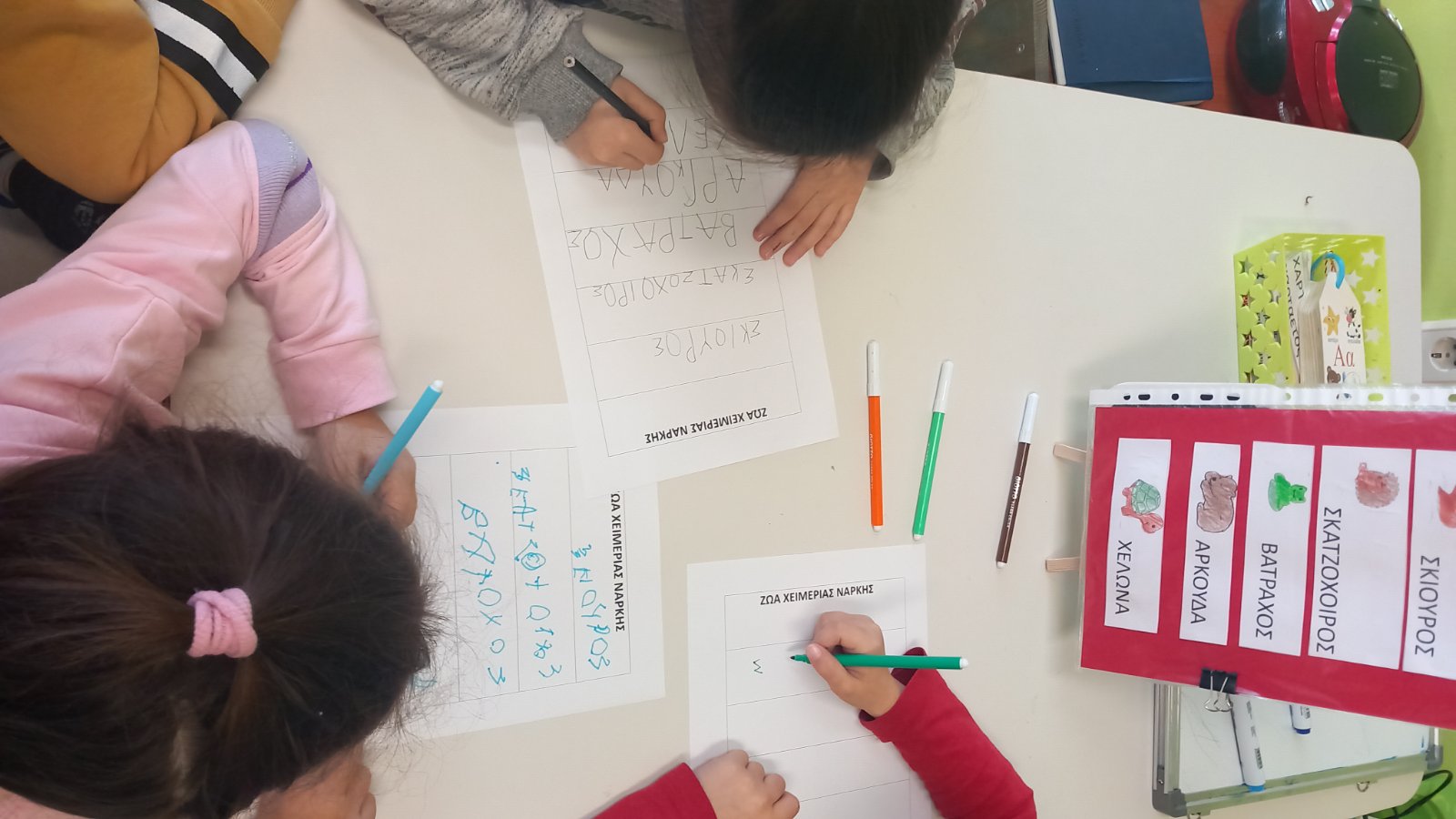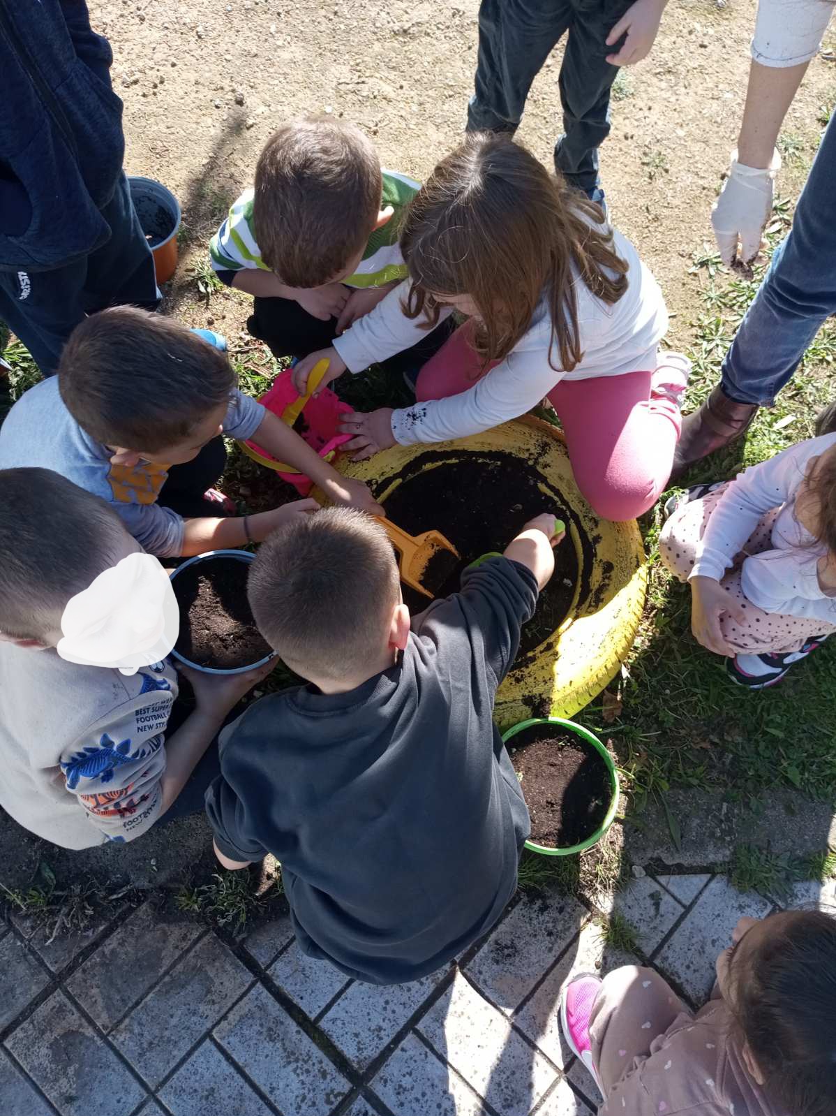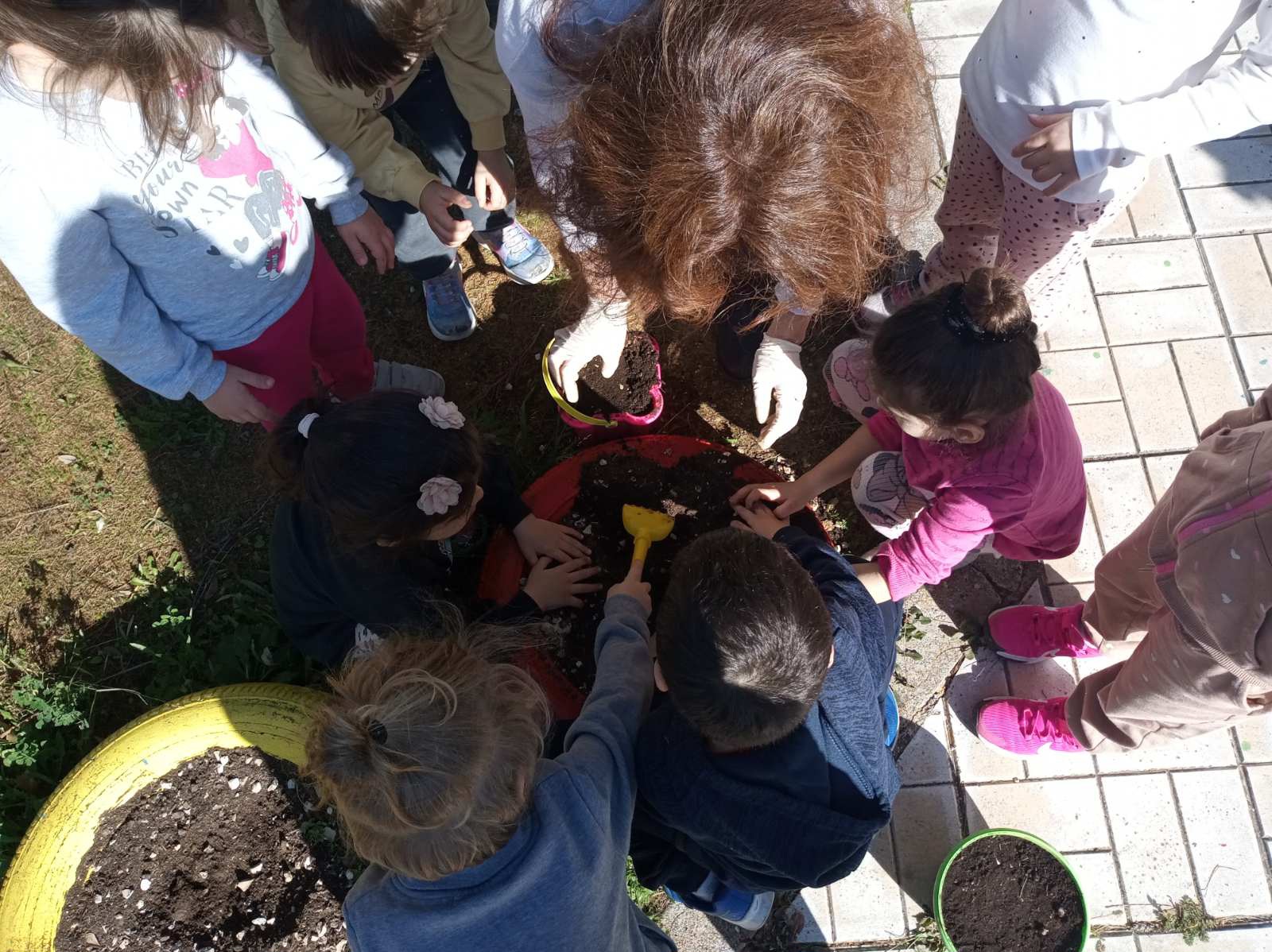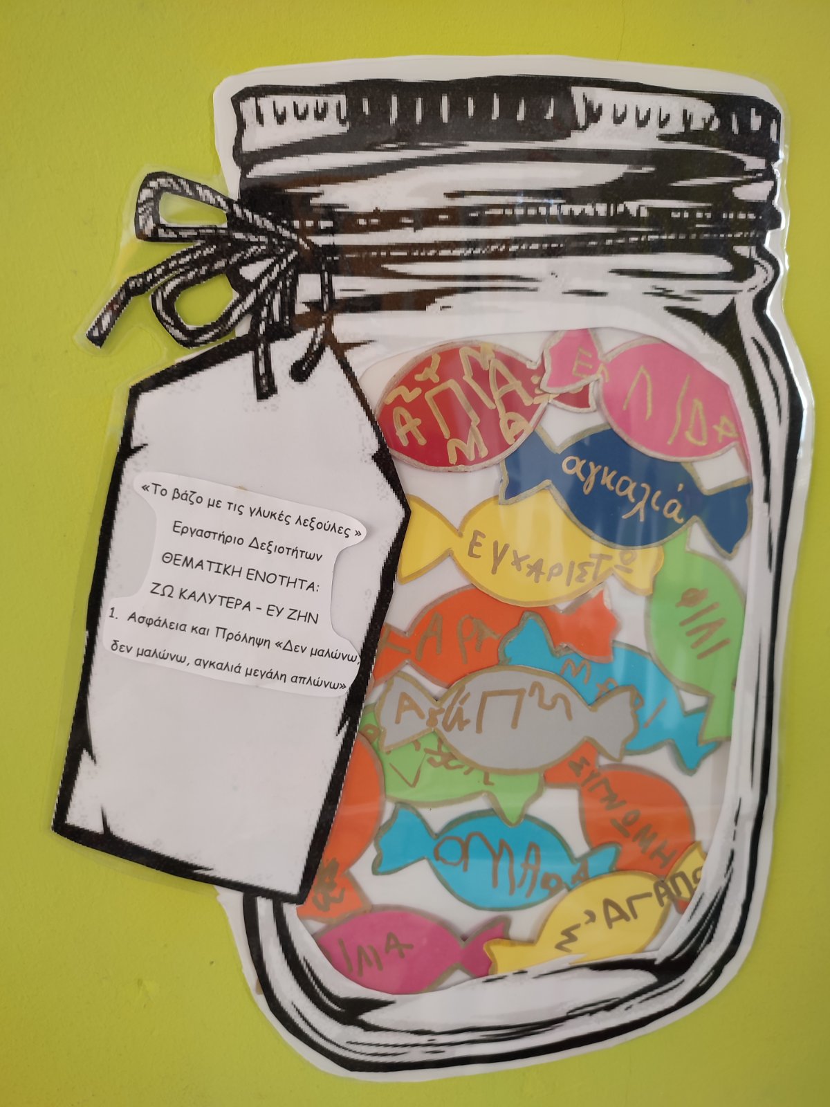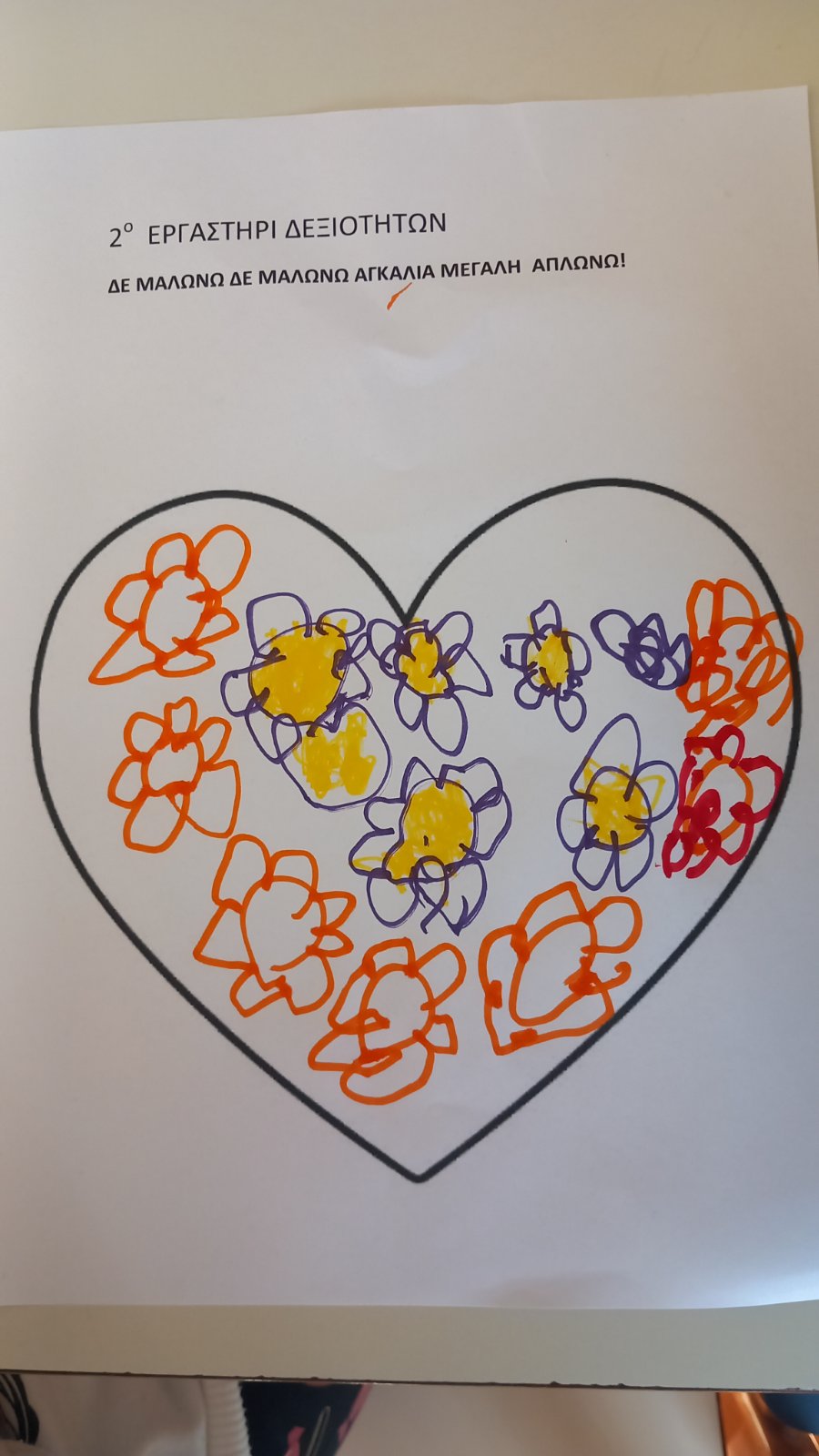 Ολοκληρώθηκε το 2ο Εργαστήριο Δεξιοτήτων για την φετινή σχολική χρονιά! Αντλήθηκε από την θεματική ενότητα «Ζω καλύτερα – Ευ ζην», και είχε ως τίτλο «Δε μαλώνω, δε μαλώνω, αγκαλιά μεγάλη απλώνω». Στο πλαίσιο του εργαστηρίου διαβάσαμε βιβλία, είδαμε βίντεο, ζωγραφίσαμε ο ένας τον άλλον αλλά και ο ένας για το άλλον, κατασκευάσαμε, ανταλλάξαμε φιλοφρονήσεις, αλλά και κάρτες αγάπης το ένα τμήμα με το άλλο, φτιάξαμε ζευγάρια συνεργασίας, αλλάξαμε τάξεις για μια μέρα, δημιουργήσαμε βάζα με λέξεις που πληγώνουν και λέξεις που στηρίζουν, αντιγράψαμε λέξεις γλυκές σαν καραμέλα, φυτέψαμε λουλούδια συνεργατικά, παρακολουθήσαμε παράσταση κουκλοθέατρου, φτιάξαμε αφίσα και κολάζ, παίξαμε ομαδοσυνεργατικά παιχνίδια και φτιάξαμε με φυσικά υλικά από την αυλή μας την καρδιά της φιλίας, αφού χορέψαμε στον κύκλο και φωνάξαμε το σύνθημα: ΔΕ ΜΑΛΩΝΩ, ΔΕ ΜΑΛΩΝΩ, ΑΓΚΑΛΙΑ ΜΕΓΑΛΗ ΑΠΛΩΝΩ!
