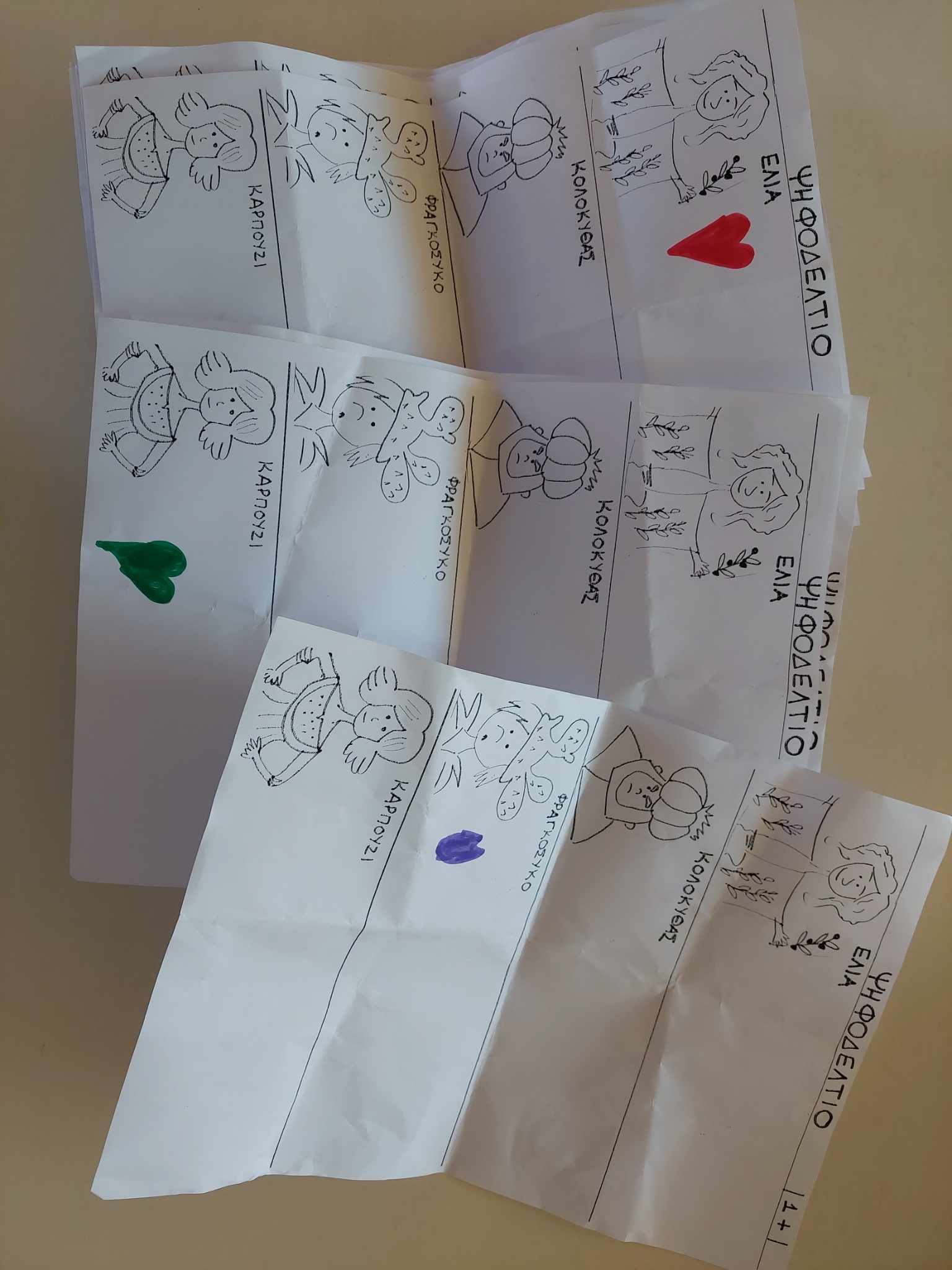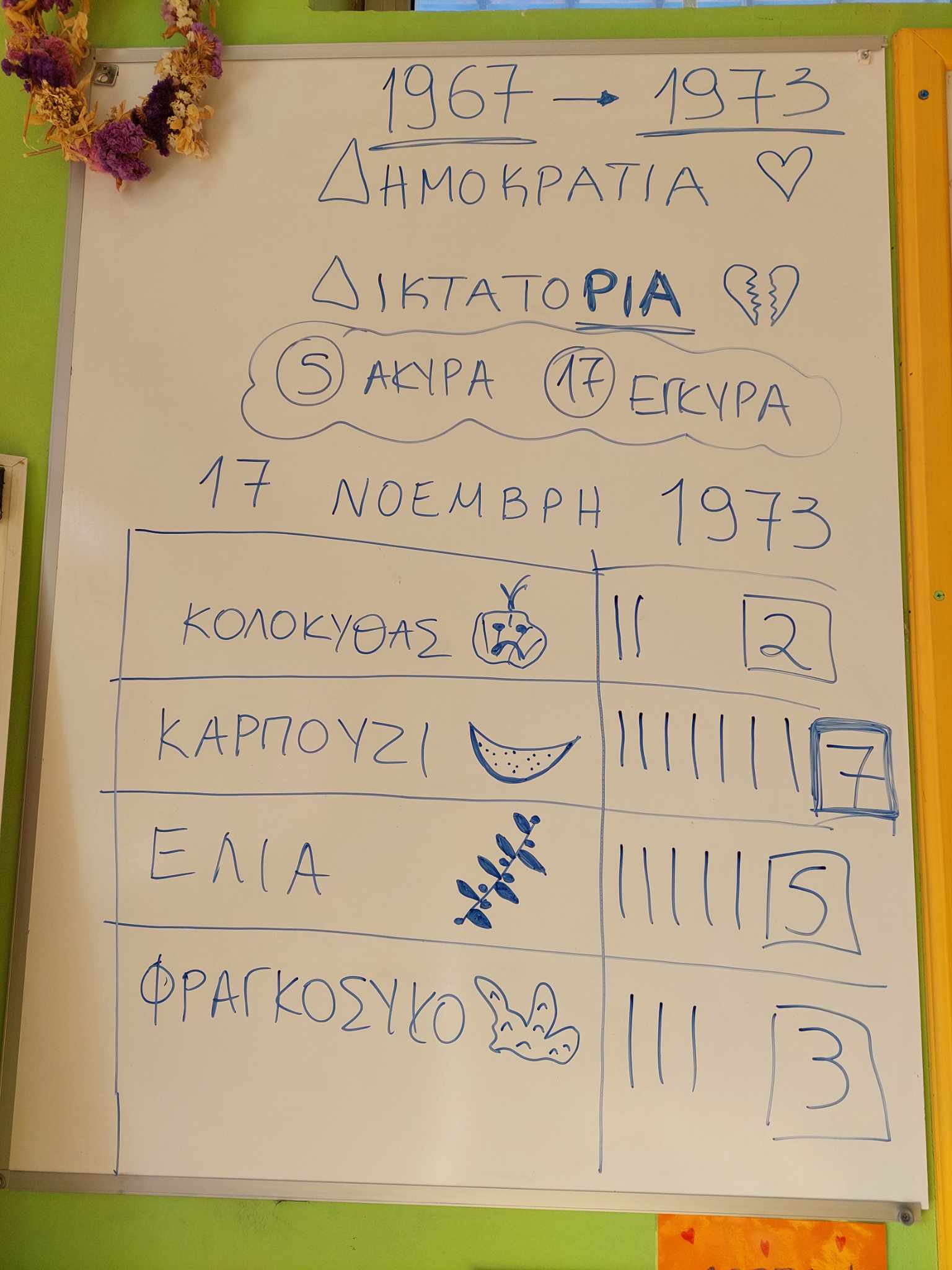 Το Πολυτεχνείο και τα γεγονότα του αποτελούν θεμελιώδη διδακτική ενότητα για την κατανόηση της έννοιας της δημοκρατίας στο νηπιαγωγείο. Φέτος, προσεγγίσαμε αυτό το θέμα μέσα από το παραμύθι “Η Σοφή ελιά”. Αφού συζητήσαμε την ιστορία του οργανώσαμε και βιώσαμε την διεξαγωγή εκλογών για να ψηφίσουμε και για να αναδείξουμε τον ήρωα που μας άρεσε περισσότερο. Η διαδικασία που ακολουθήθηκε από τα παιδιά ήταν μια προσομοίωση της πραγματικής διαδικασίας με ταυτότητες, ψηφοδέλτια, κάλπη και εκλογικά αποτελέσματα. Όλοι μας σεβαστήκαμε το αποτέλεσμα και κατανοήσαμε τη σημασία της δημοκρατίας στη ζωή μας σε αντίθεση με τα δεινά της δικτατορίας.