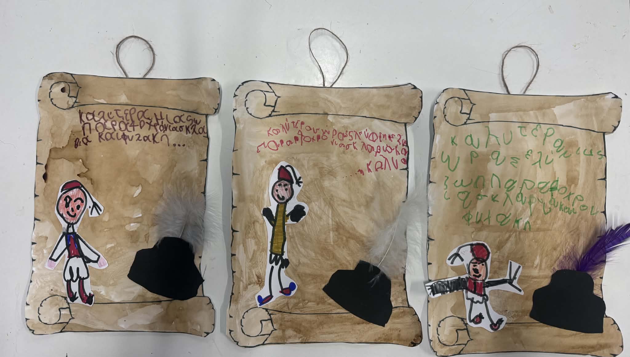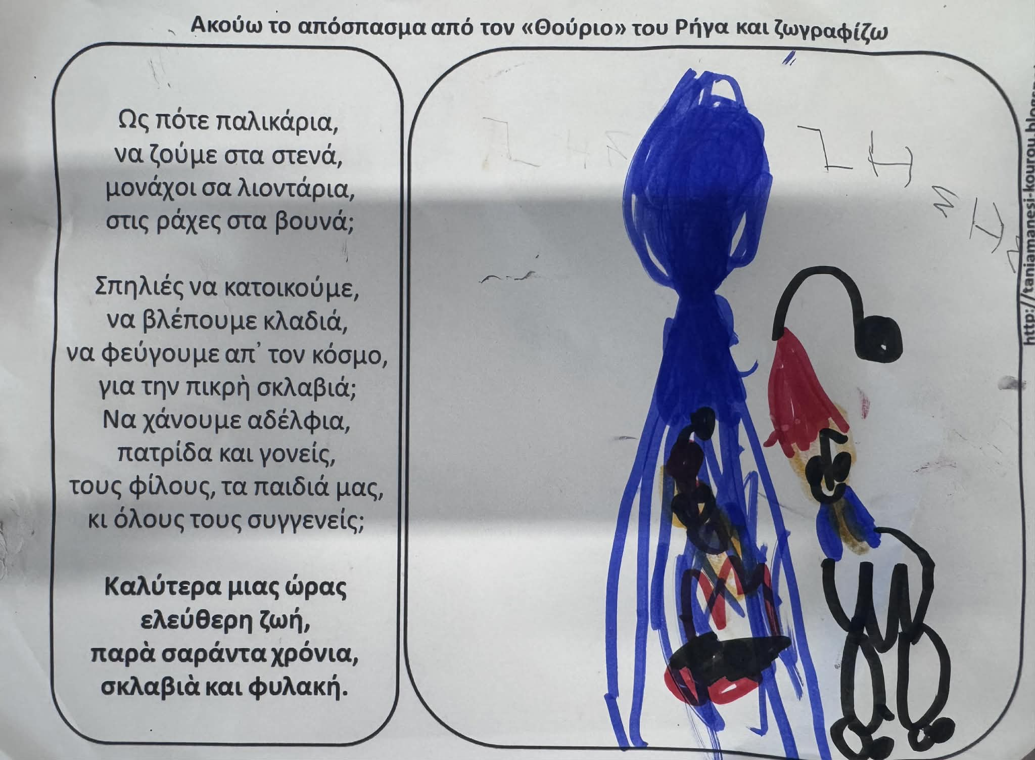 Ακούν και μαθαίνουν το τραγούδι του “Θούριου” και προσπαθούν να αποδώσουν τους στίχους εικαστικά.