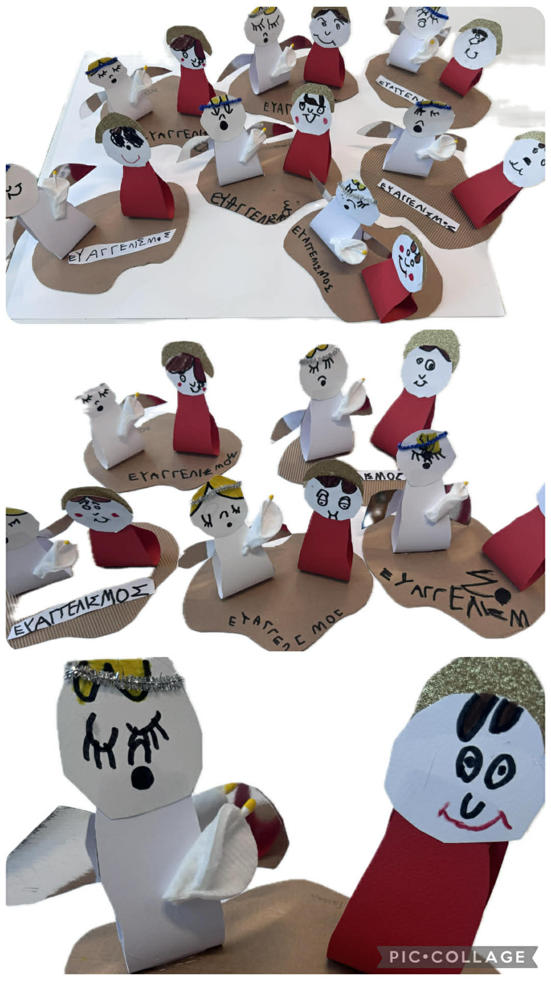 Κατά την διάρκεια του εορτασμού των δύο αυτών γιορτών σε πρώτη φάση ασχοληθήκαμε με τον εορτασμό του Ευαγγελισμού της Θεοτόκου,οι μαθητές παρατήρησαν πίνακες ζωγραφικής και έμαθαν για την ημέρα που ο Αρχάγγελος Γαβριήλ έδωσε τον κρίνο στην Παναγία και της ανακοίνωσε ότι θα φέρει στον κόσμο τον Χριστό.Δραματοποίησαν την ιστορία και έκαναν αναγραμματισμό των λέξεων. Στην συνέχεια έφτιαξαν τον δικό τους πίνακα και έγραψαν τις αντίστοιχες λέξεις.
