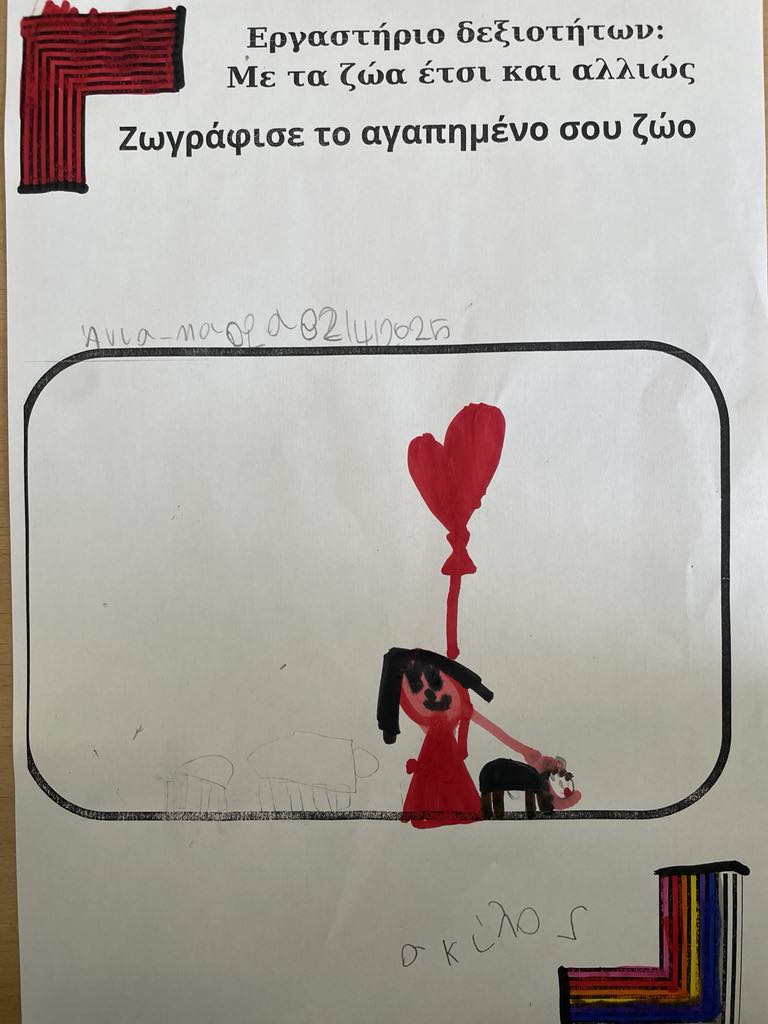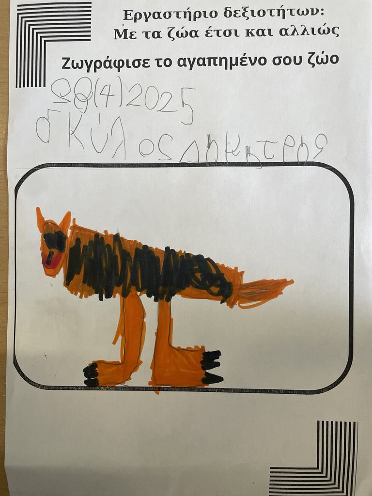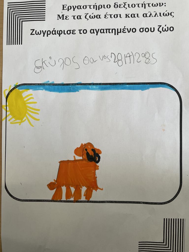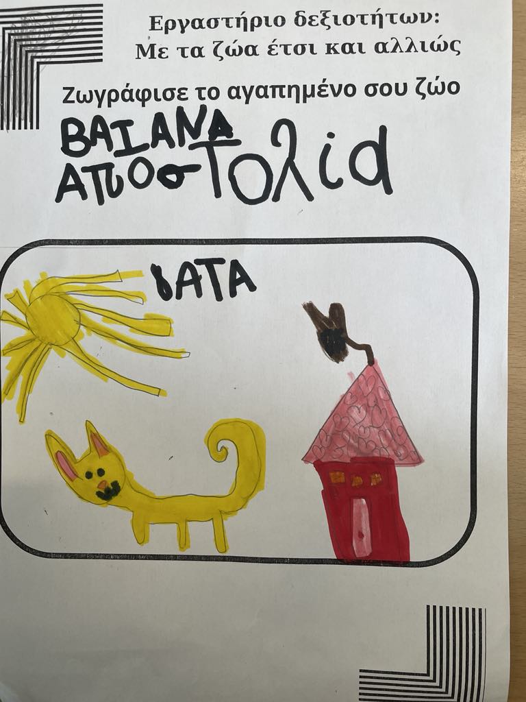 Δραστηριότητα 2 – το κατοικίδιό μου: Τα παιδιά ζωγράφισαν το κατοικίδιό τους ή το αγαπημένο τους ζώο και αντί να το περιγράψουν, χρησιμοποίησαν τον αφηρημένο περιγραφικό λόγο και τα κριτήρια των προηγούμενων κατηγοριών. Έτσι, δίχως να που το ζώο τους, το περιέγραφαν σύμφωνα με το που ζει, τι τρώει, τι χρώμα έχει στους συμμαθητές τους. Εκείνος, που το έβρισκε κέδριζε ένα πόντο.